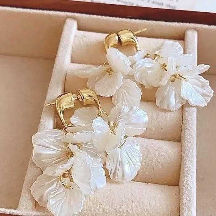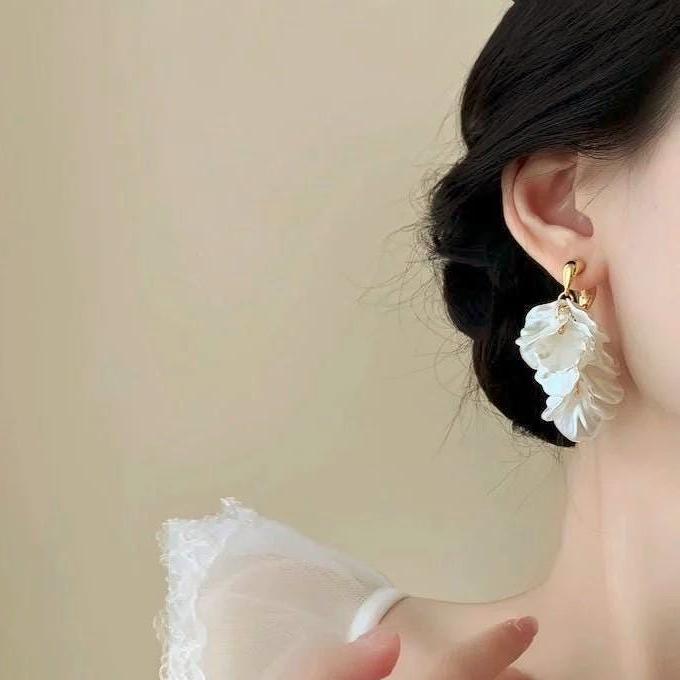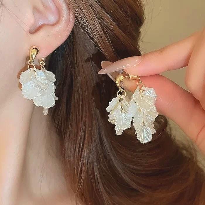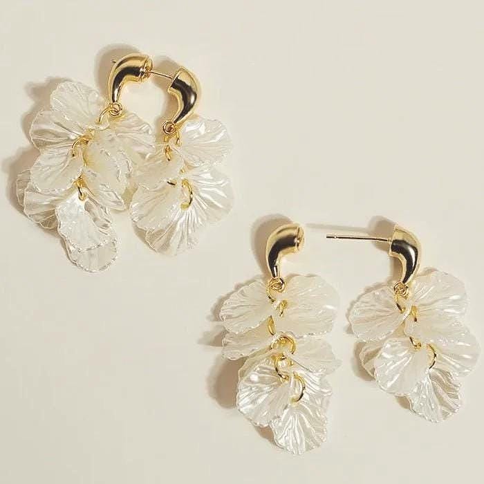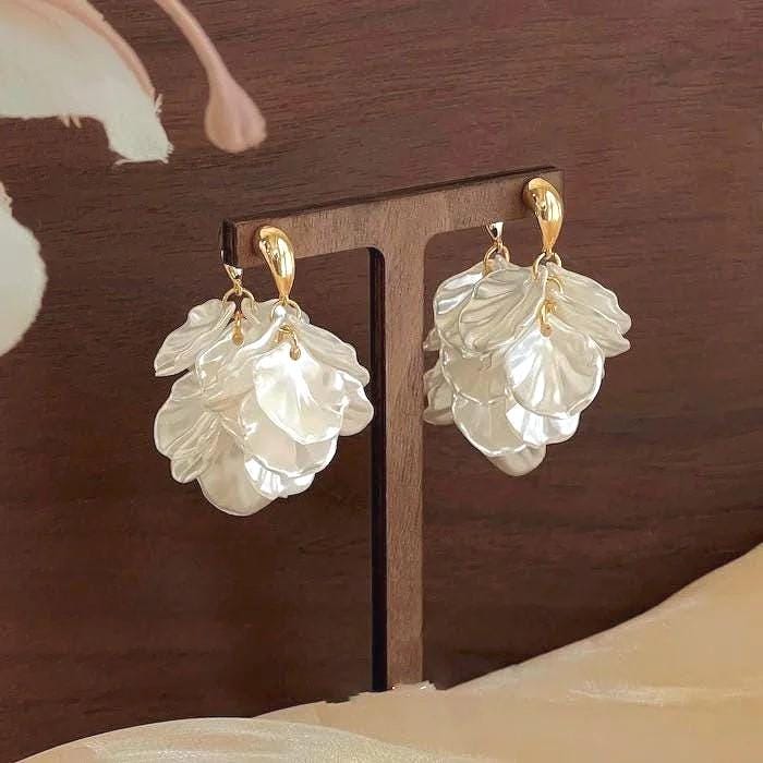 White pearl flower drop earrings, gold floral statement earrings, iridescent acrylic bridal jewelry—these luminous pieces bloom with soft radiance from the moment they touch the light.