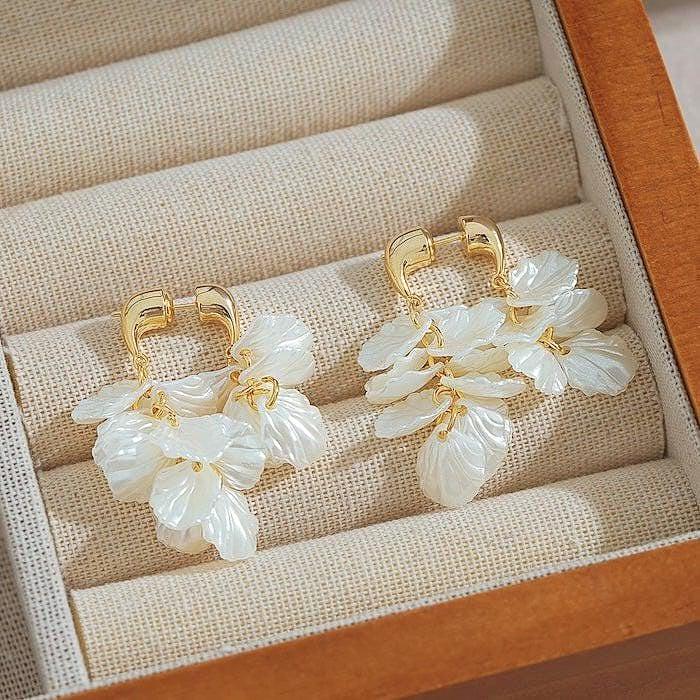 Each earring begins with a smooth, golden brass top, polished and plated for a warm, luxurious glow. Beneath it cascade sculpted translucent petals, delicately layered acrylic flowers shaped like drifting blossoms caught in a gentle breeze. Their iridescence shimmers like quiet waves, echoing the magic of moonlit water and the grace of hand-carved shell.