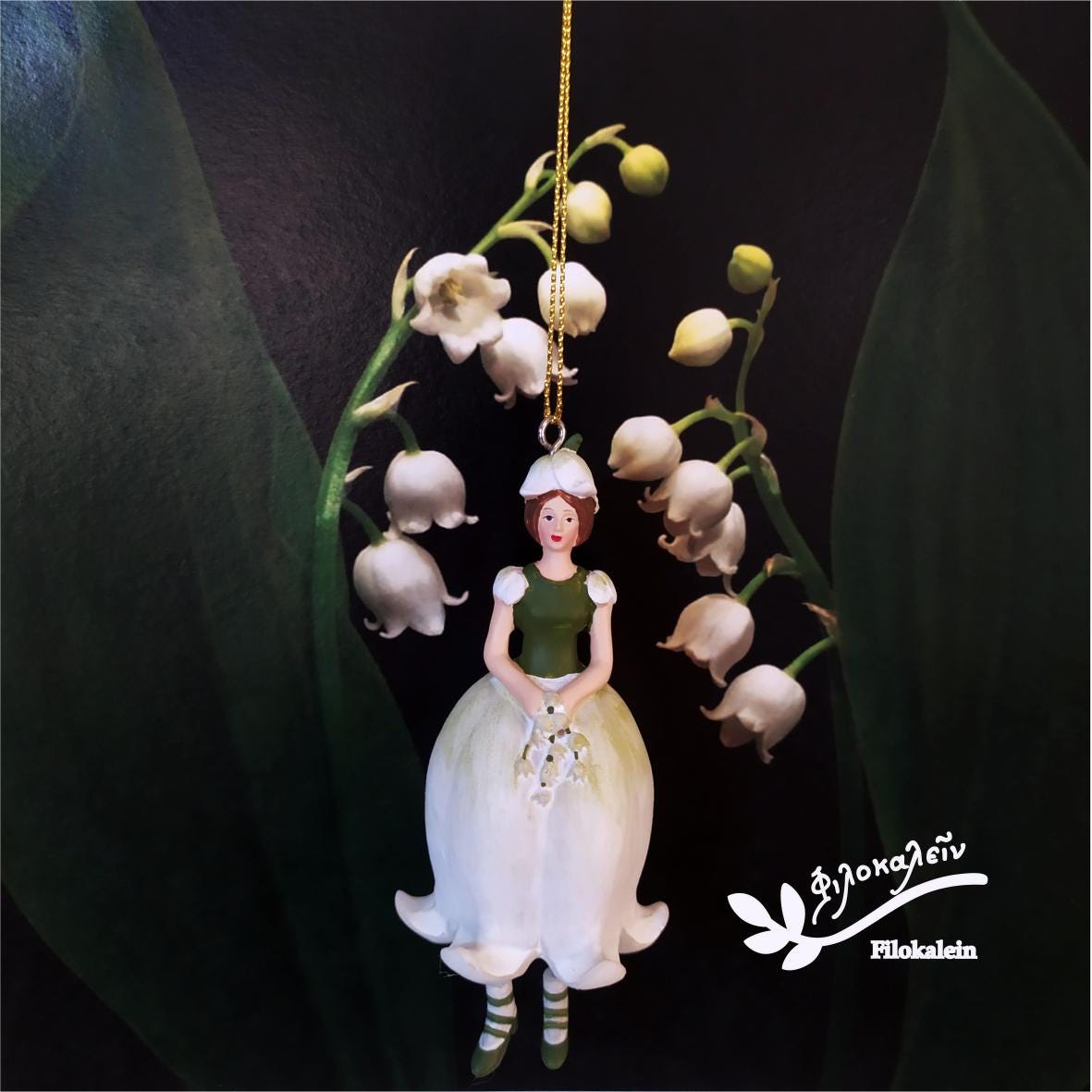 The fairy can be gifted with a custom-designed handcut gift card, beautifully color-printed with the Lily of the Valley and its symbolism of rebirth, chastity, purity, sweetness, motherhood. Let us handwrite your message in our signature calligraphy-style font, in Greek or English - a touch of poetic elegance, perfect for expressing gratitude, affection, or a heartfelt wish.