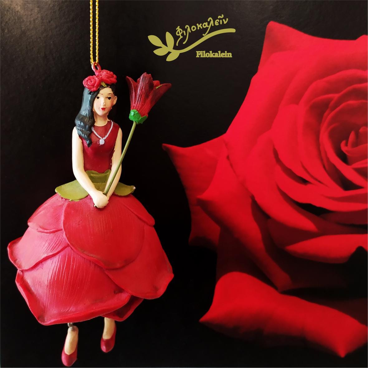 This red rose flower fairy ornament blossoms with timeless elegance—her radiant red skirt a symbol of love, passion, and devotion, and her green bodice grounding her in the heart of nature.