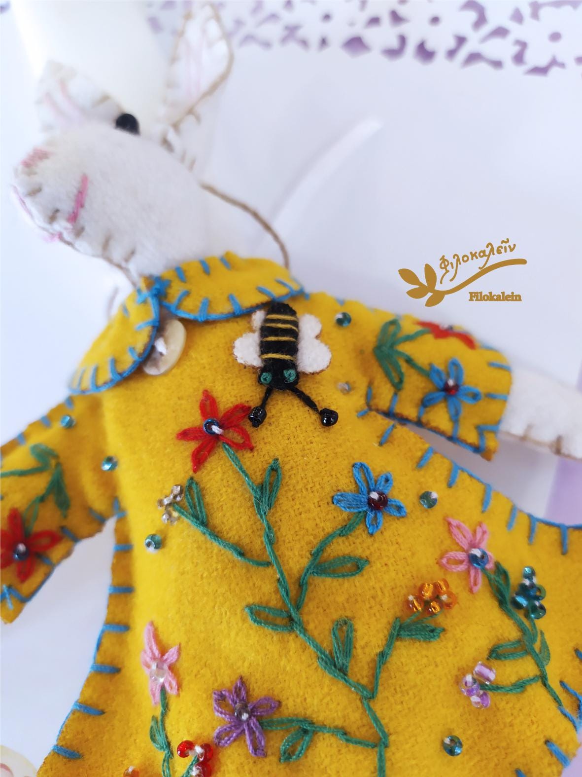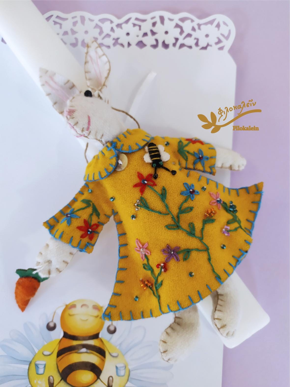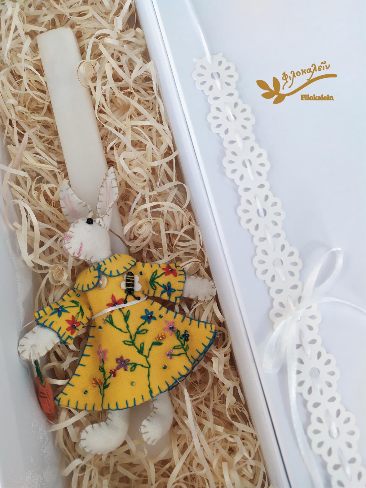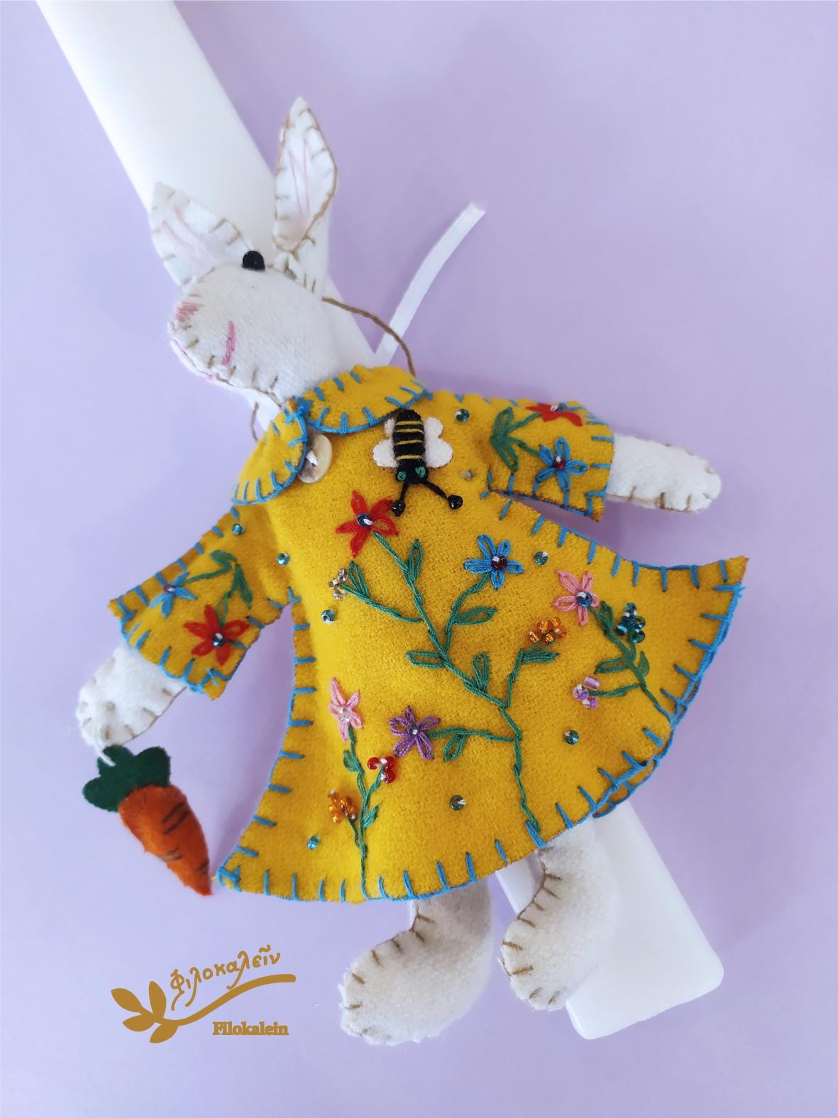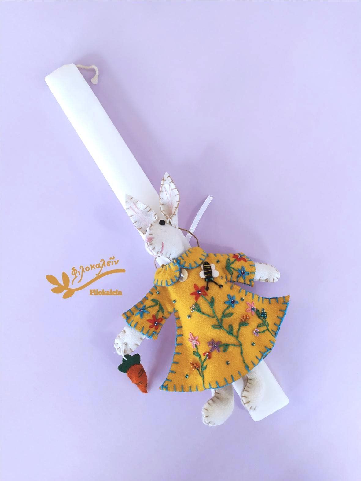 This handmade Greek Easter candle is adorned with a tender felt rabbit, lovingly holding a carrot and dressed in a hand-stitched yellow dress embroidered with spring florals. Every stitch honors craftsmanship, patience, and the magic of childhood.