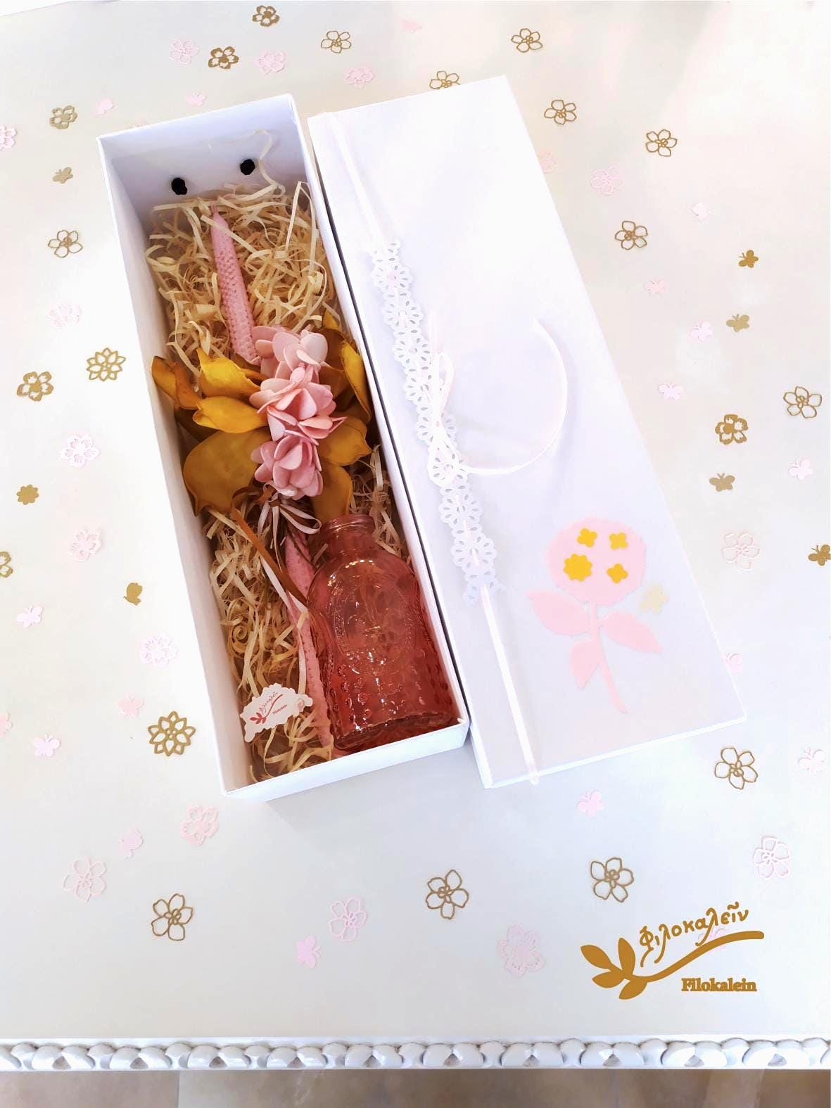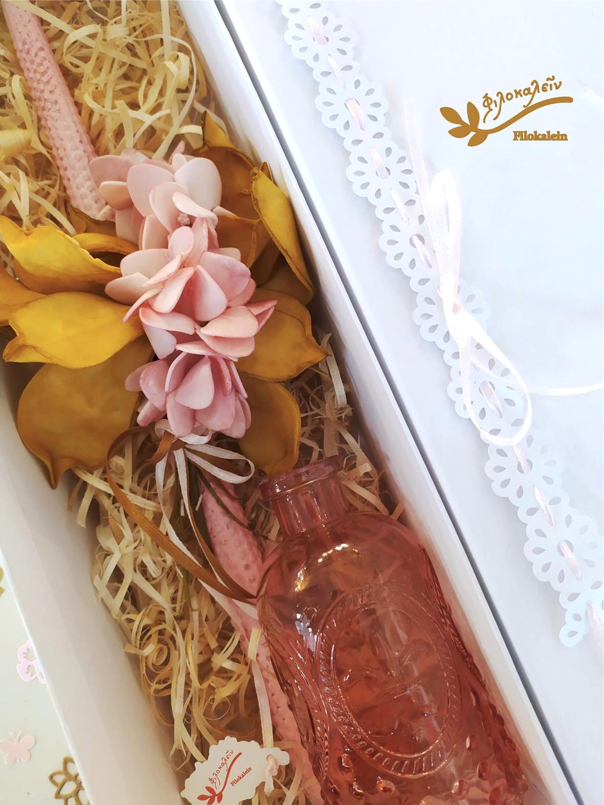 This Greek Easter lampada is adorned with handmade fabric flowers in blush pink and warm yellow tones, shaped into a romantic bouquet that feels gathered from a quiet spring garden. Soft, sculptural petals embrace the candle with elegance and grace.