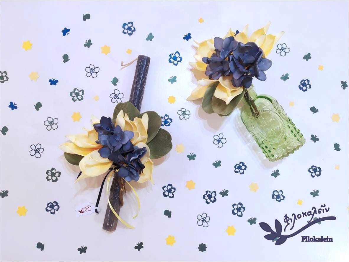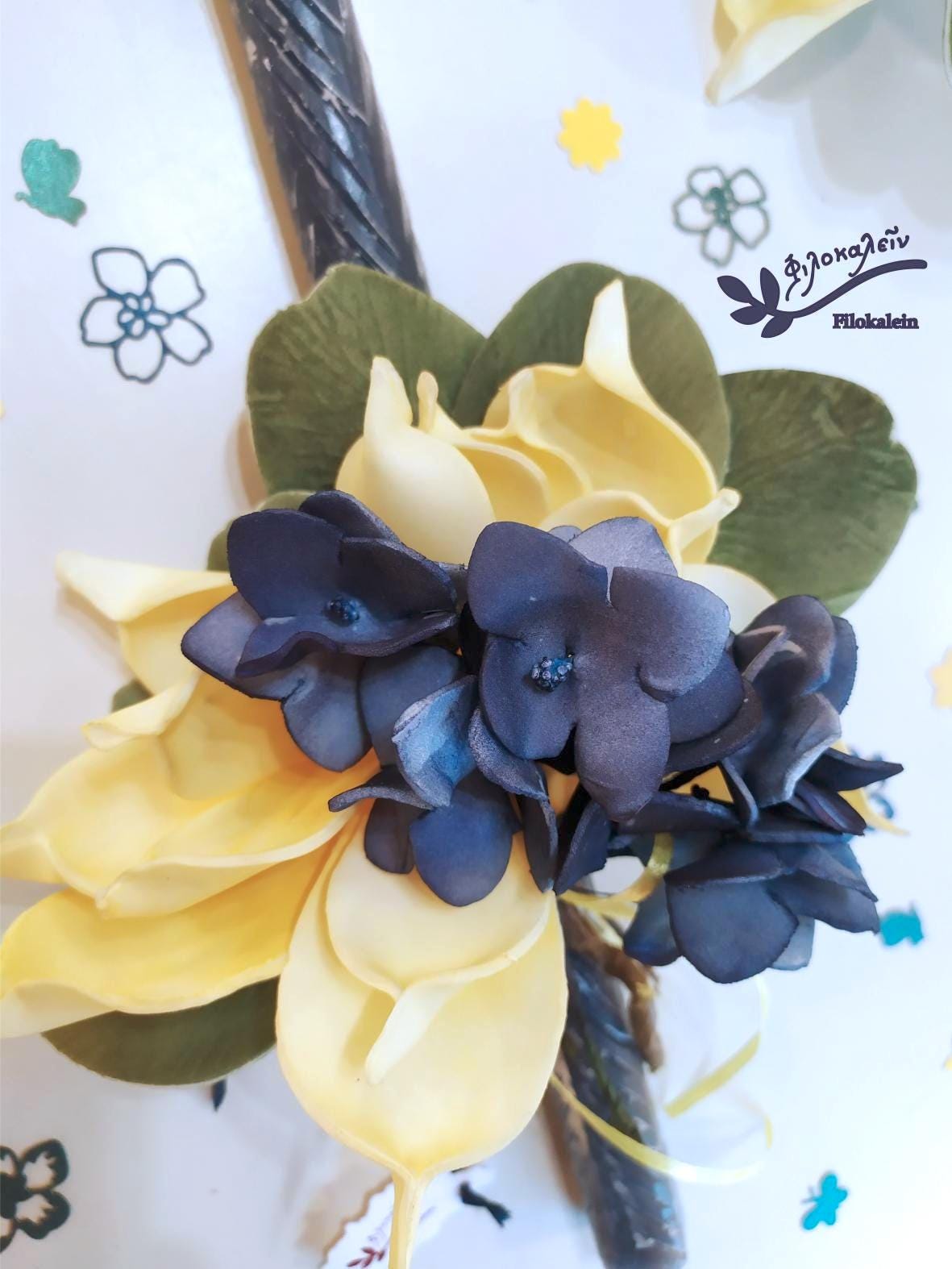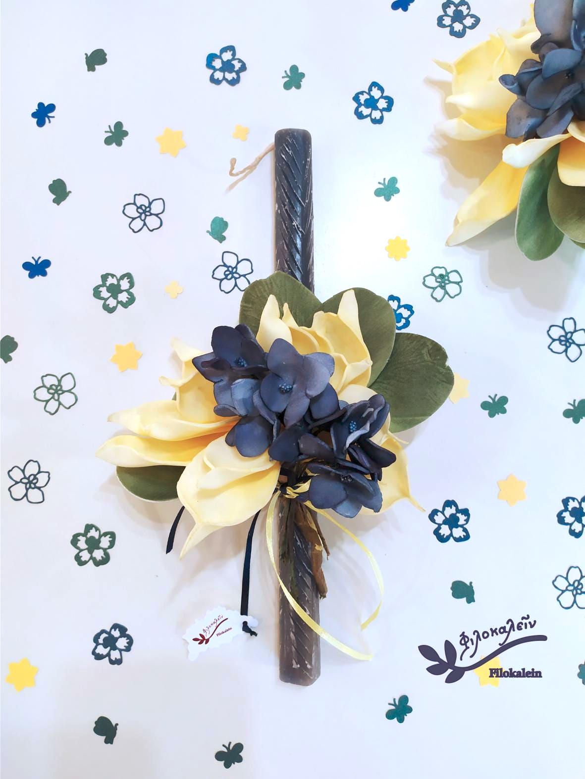 This Greek Easter candle is adorned with an elegant latex flower bouquet in deep navy blue and soft yellow tones, embraced by green leaves that create a harmonious spring composition. The sculptural flowers rest gracefully against the candle, forming a romantic Easter lampada that feels both refined and joyful.