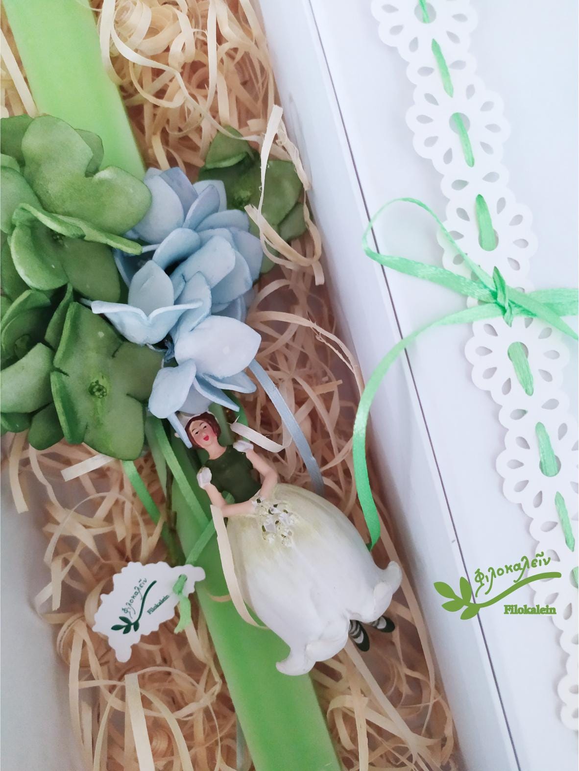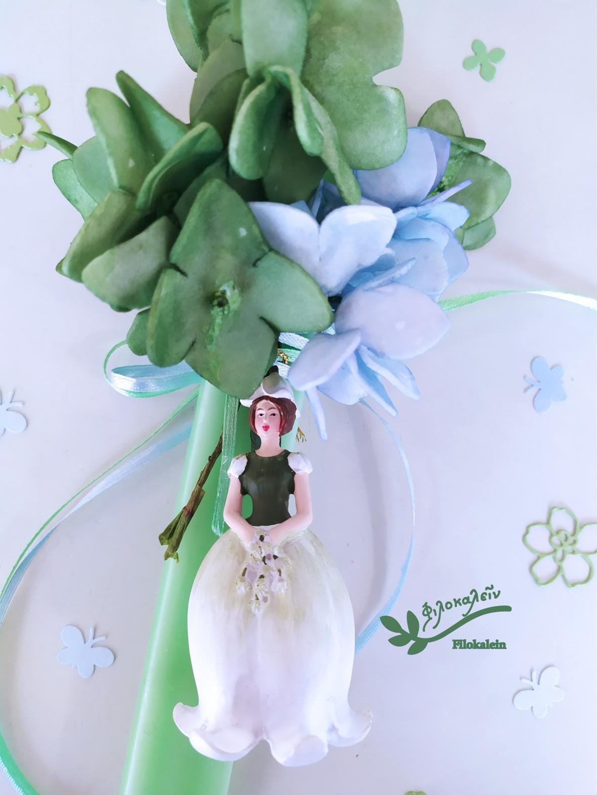 Celebrate the sacred season of renewal with this handmade Greek Orthodox Easter lampada, featuring a delicate Lily of the Valley flower fairy dressed in a white skirt with puffed sleeves and dark green bodice, paired with a vibrant floral bouquet in soft green and light blue hues. This exquisite Orthodox Easter candle blends heartfelt symbolism with artisanal beauty, making it a treasured gift for a goddaughter, teenage girl, mother, or close friend.
