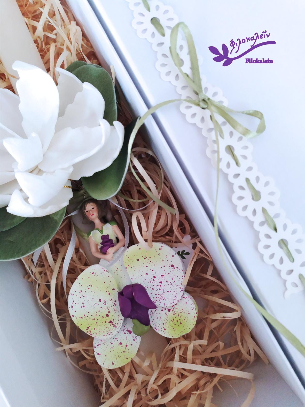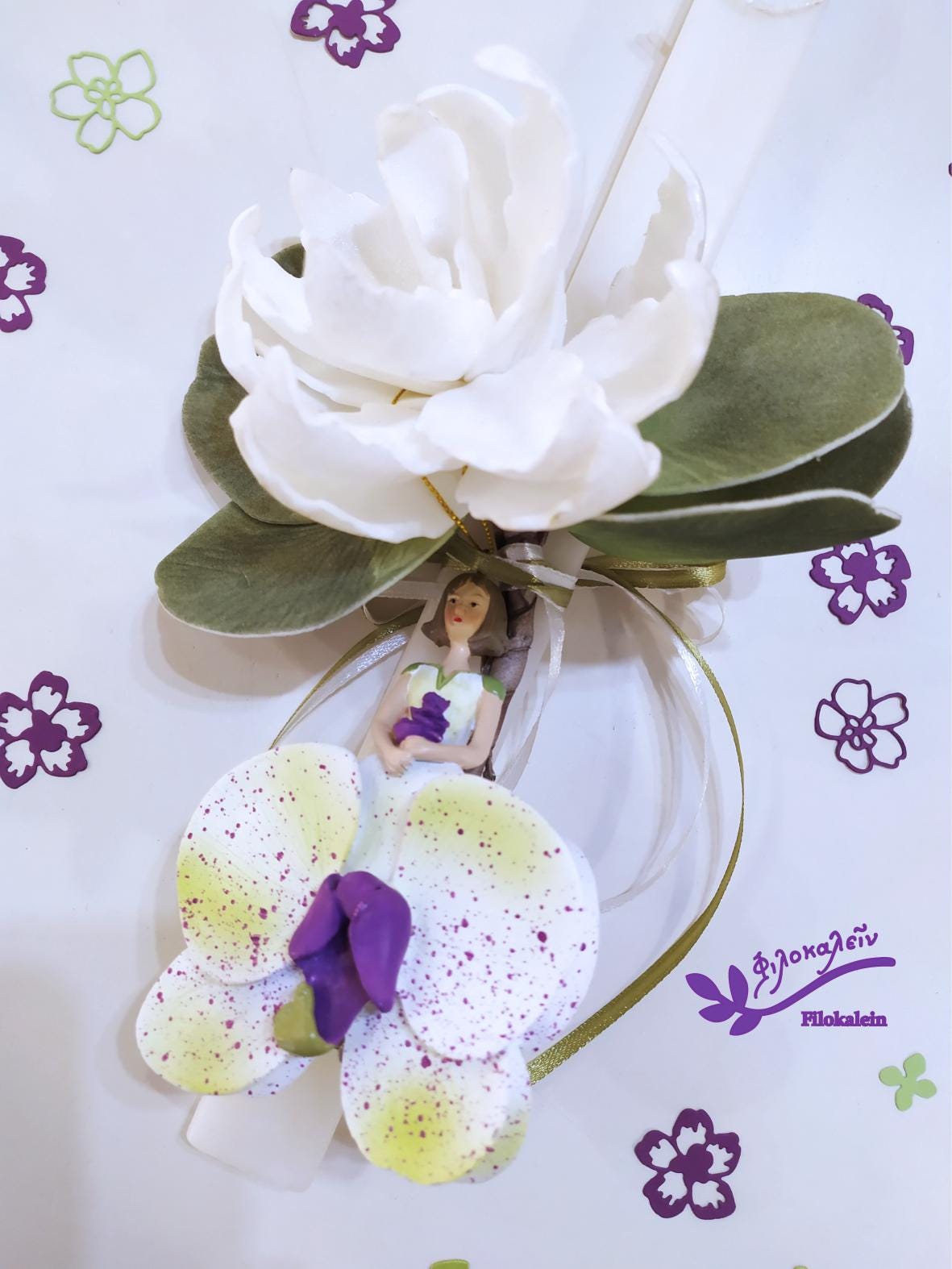 Greek Easter Lampada with White Orchid Fairy & Latex Flowers – Handcrafted Floral Easter Candle, Orthodox Easter Gift for Girls