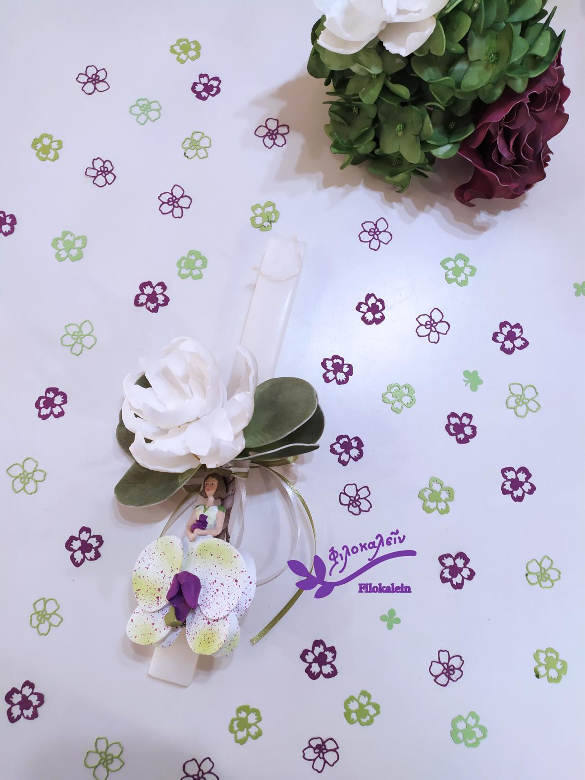 Celebrate Easter with a handcrafted Greek Easter lampada, designed to honor renewal, faith, and beauty. This elegant Orthodox Easter candle features a graceful white orchid flower fairy paired with a removable latex floral bouquet in soft white and fresh green tones, highlighted by a deep purple orchid column.