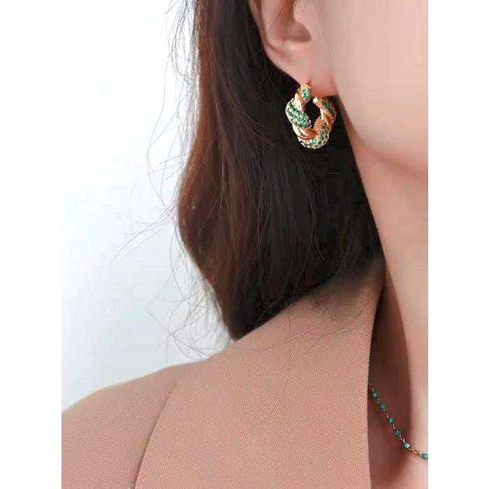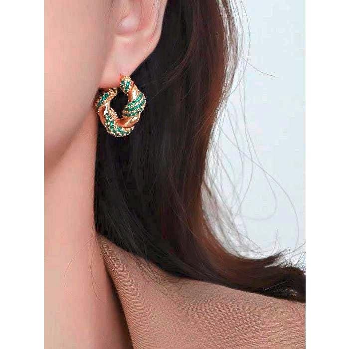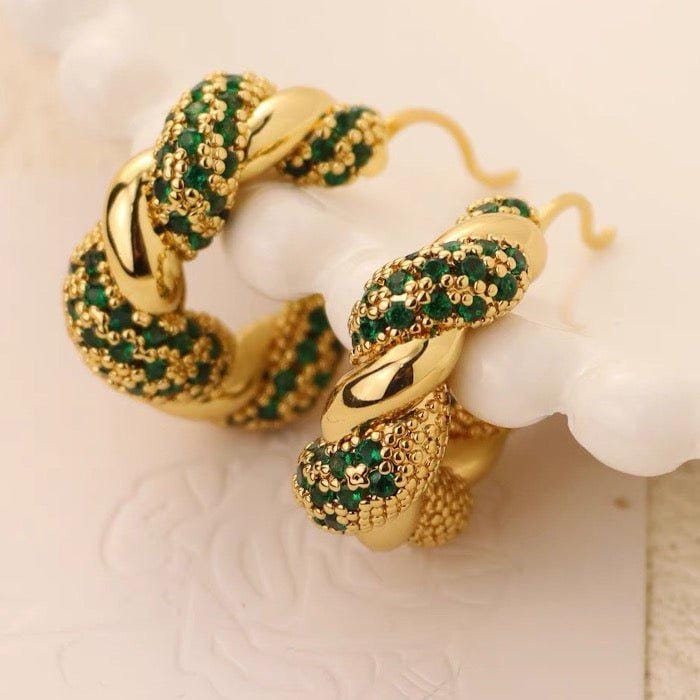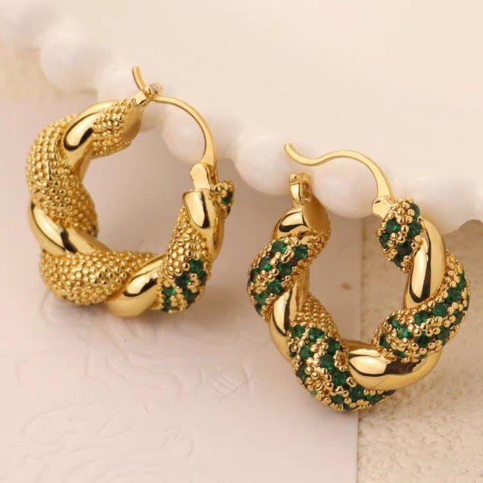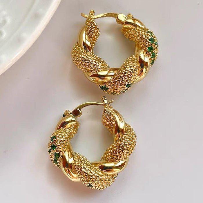 Expertly crafted from luminous gold-plated brass and adorned with radiant green stones, each hoop tells a story of vintage glamour reimagined. The braided twist design evokes the charm of retro 80s statement jewelry, while the green detailing adds a modern breath of nature’s beauty.