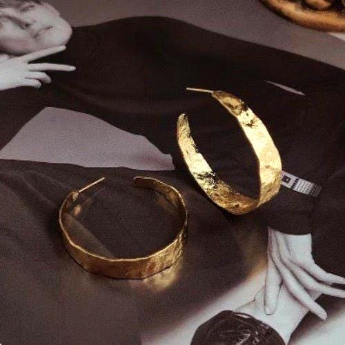 Handcrafted from brass and luxuriously gold-plated, their textured surface glistens in the light, catching the eye without asking for it. Designed with a wide, open hoop silhouette and a radiant, hammered finish, these earrings channel the power of vintage 80s fashion with a contemporary touch.