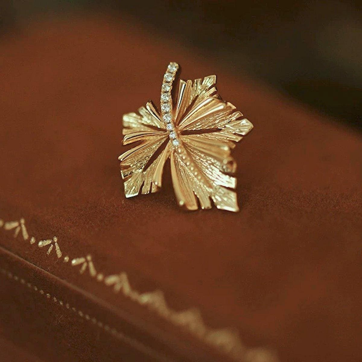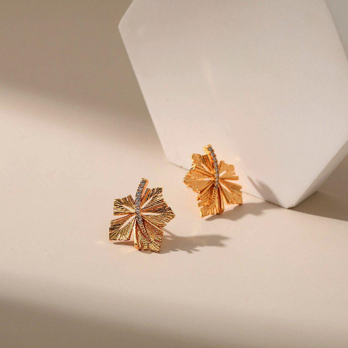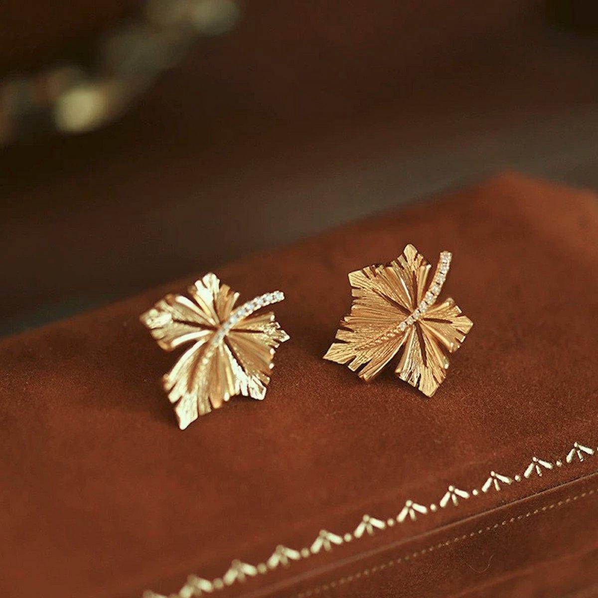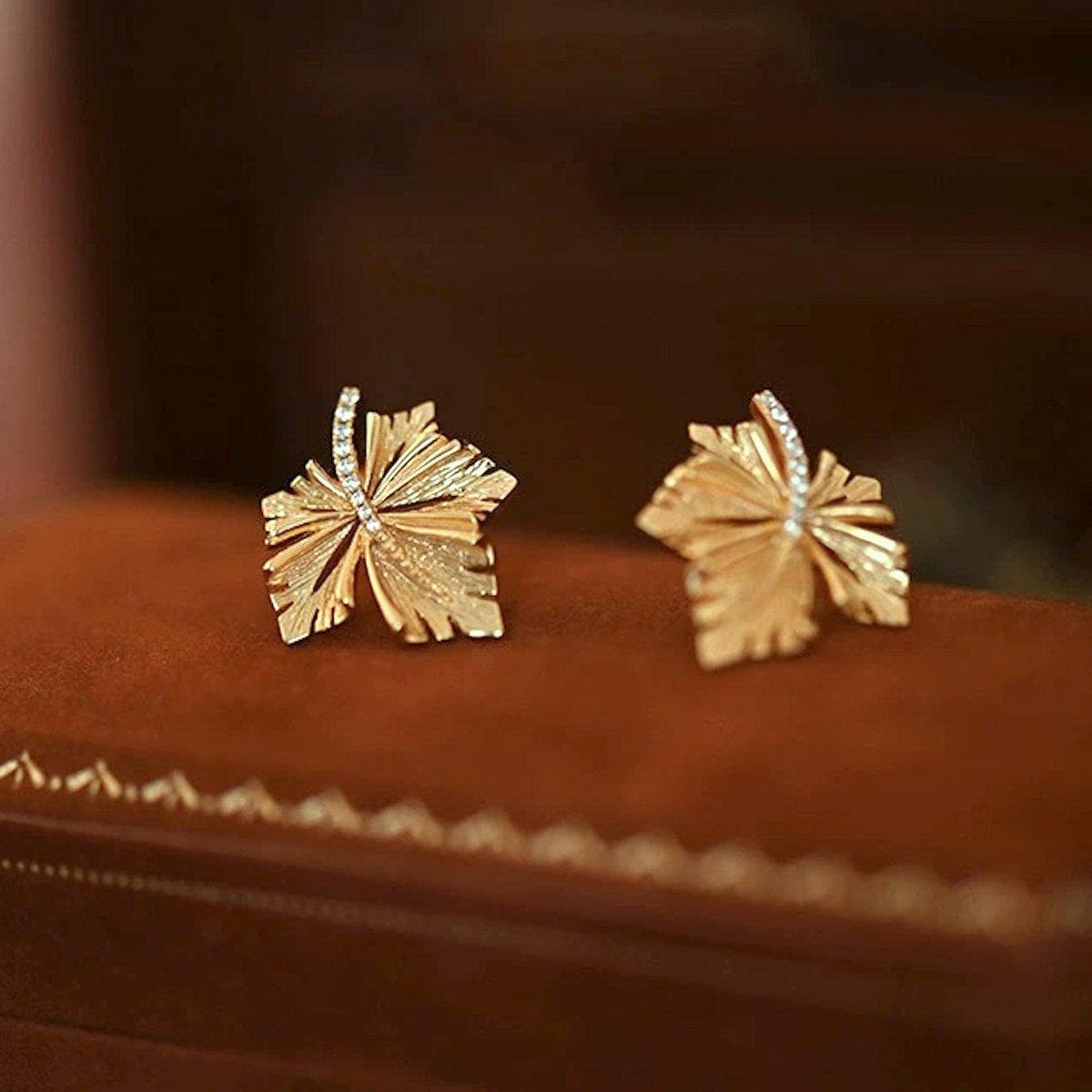 Crafted in gold-plated brass and shaped into a sculptural maple leaf design, they make the ideal nature inspired jewelry for daily wear, fall weddings, or heartfelt gifting. Their sparkling accents catch the light like dew on morning leaves.