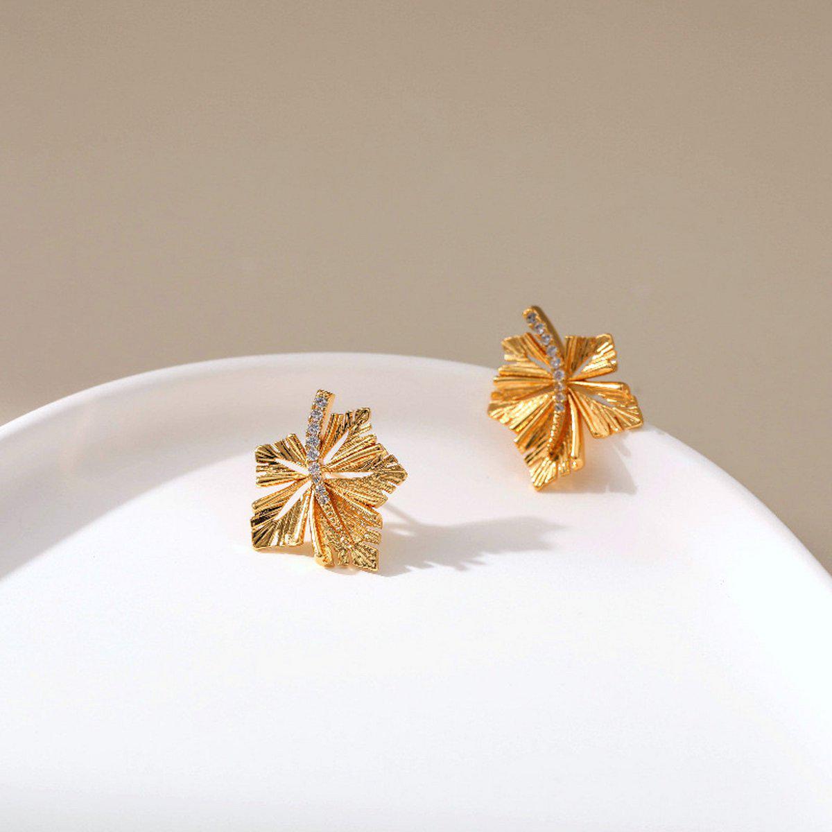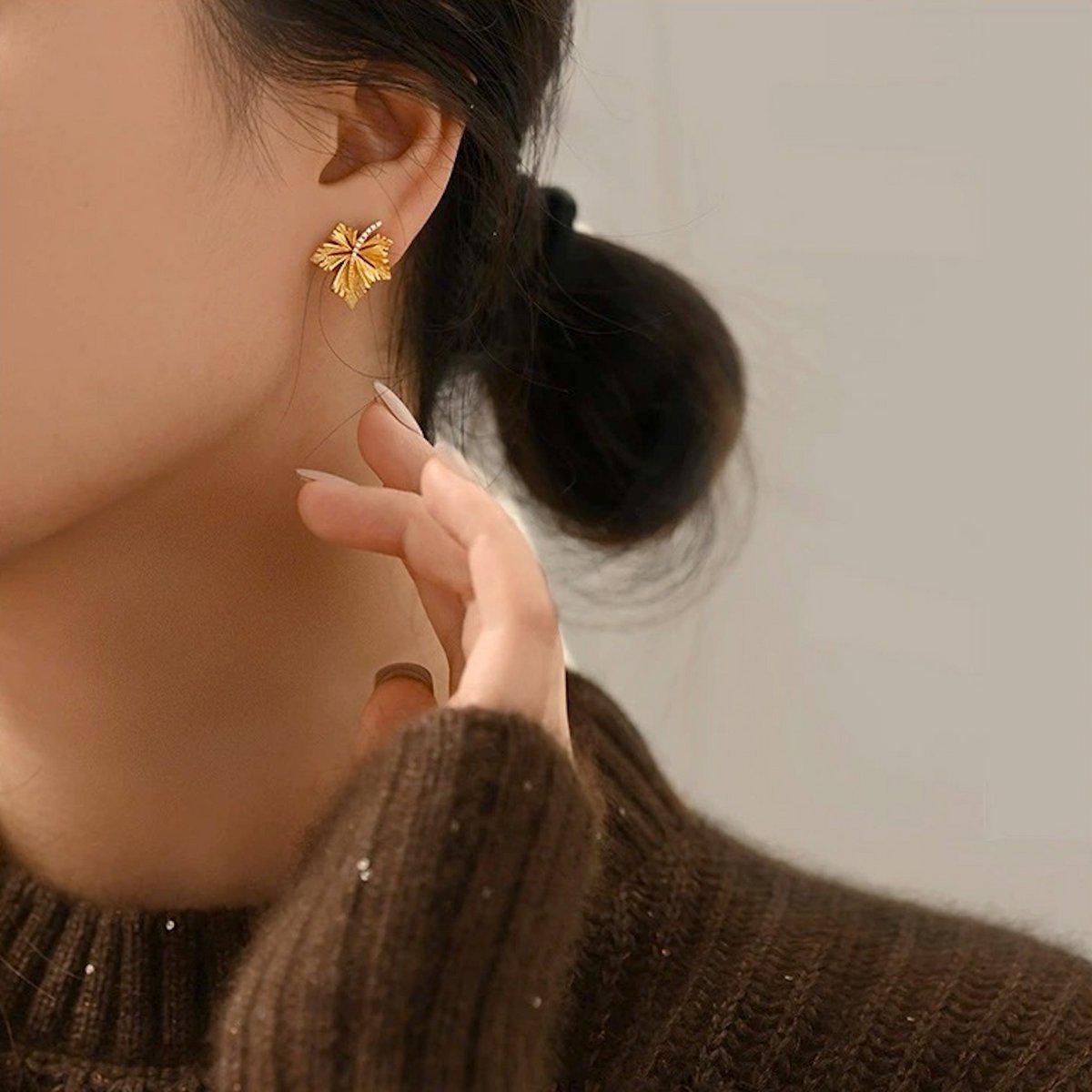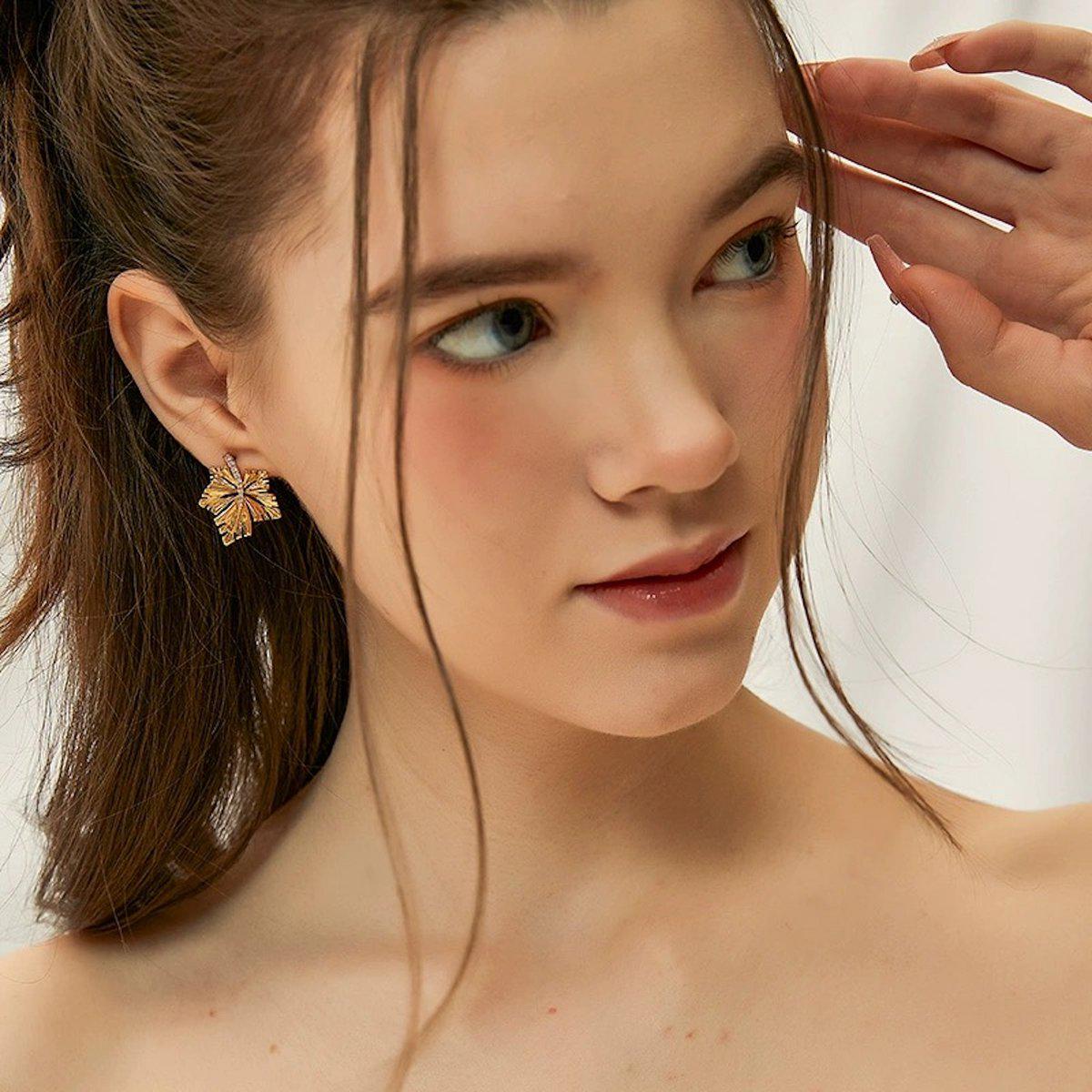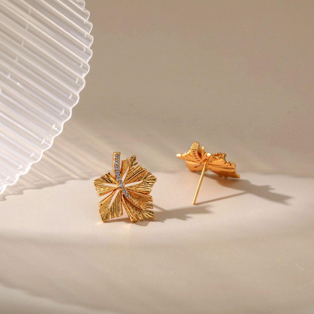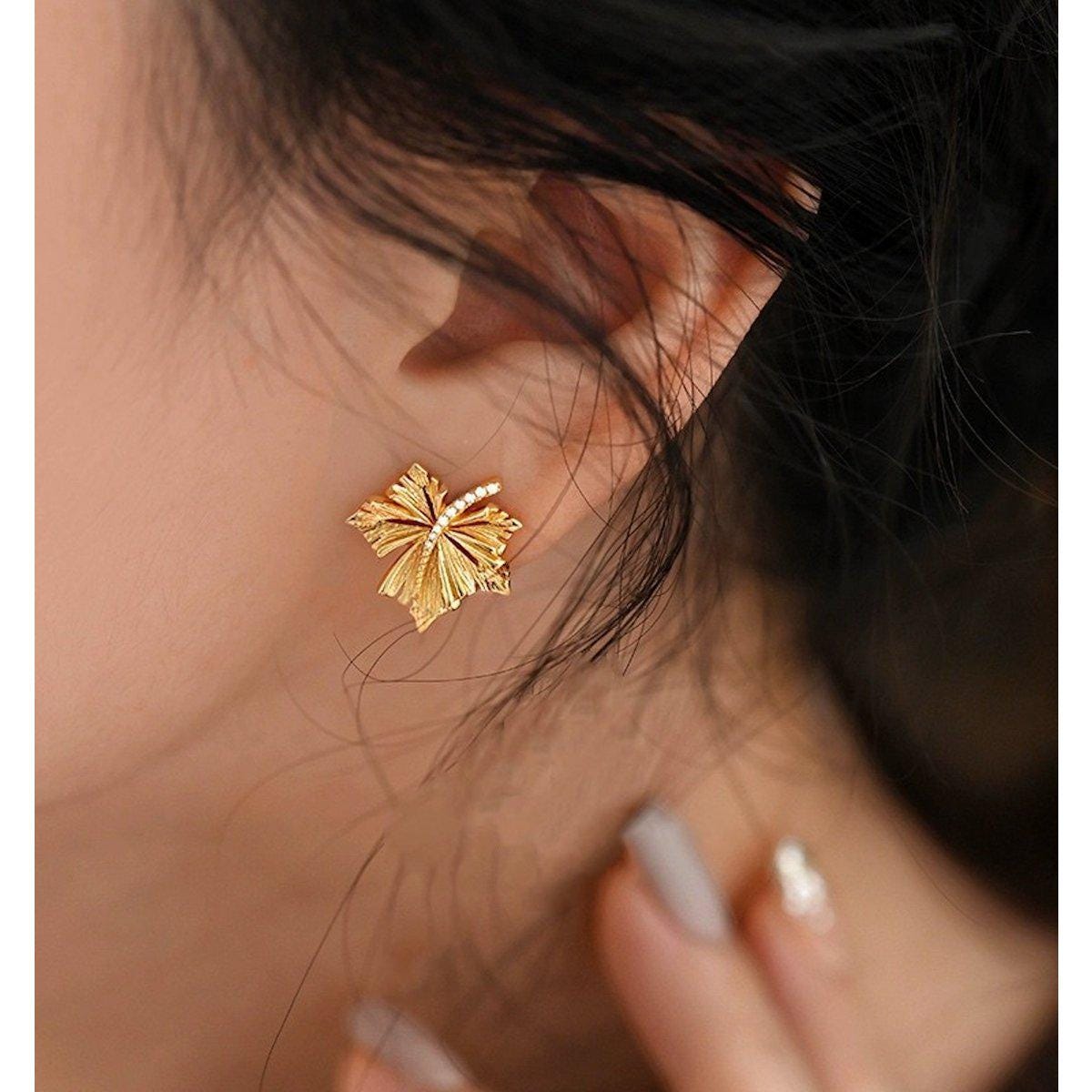 Crafted in gold-plated brass and shaped into a sculptural maple leaf design, they make the ideal nature inspired jewelry for daily wear, fall weddings, or heartfelt gifting. Their sparkling accents catch the light like dew on morning leaves.
