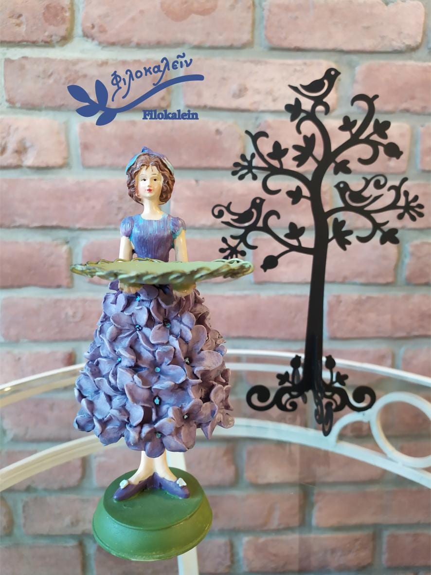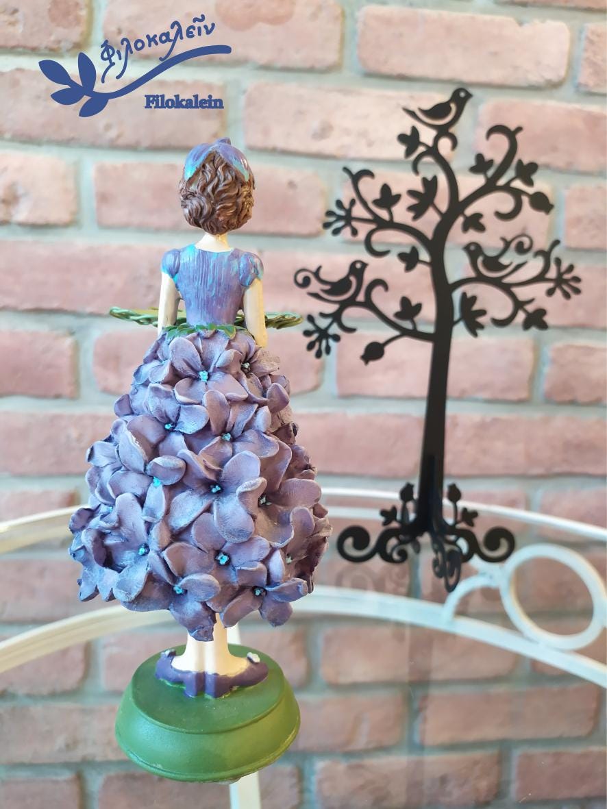 Lilac girl candle holder, flower figurine tealight holder — a gentle keeper of light, dressed in blossoms the color of early spring dreams. Her gown is woven from sculpted lilac petals, each one whispering the meanings lilacs have carried for centuries: innocence, first love, renewal, and the soft awakening of the heart.