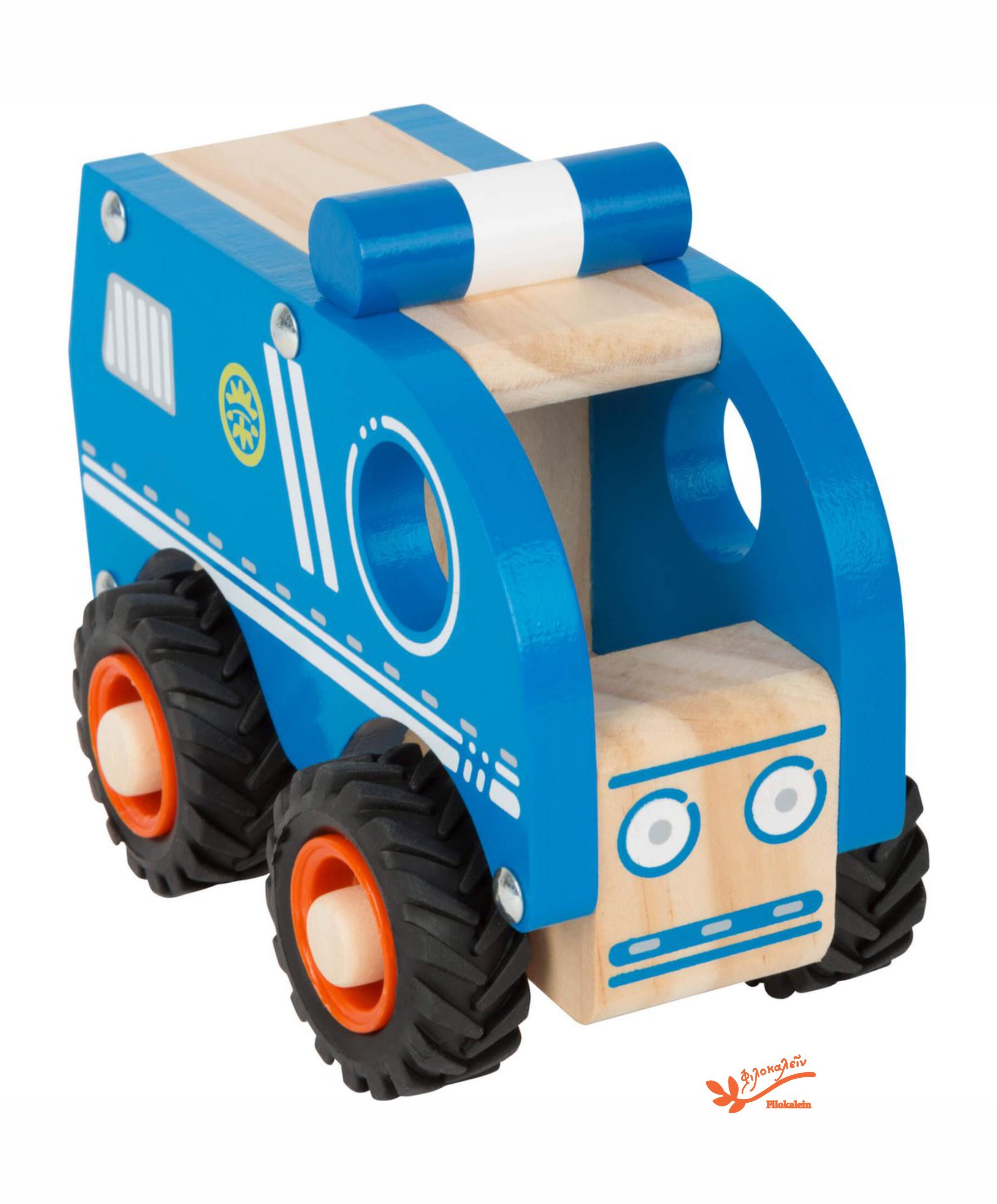 Made from FSC® 100%-certified wood, this sturdy police vehicle features quiet rubber tyres, easy-to-grip openings, and a friendly little face that invites storytelling and creative play. There’s room in the back for imaginary thieves, while the tiny policeman takes the wheel and restores order to the playroom streets.