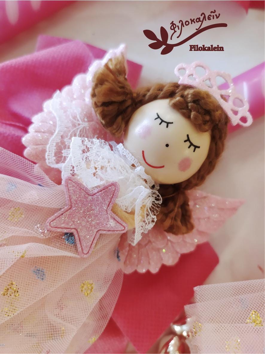 This handmade Princess Easter lampada is a romantic Greek Easter candle created especially for girls who believe in magic. A soft pink fairy angel princess rests on the candle, her tulle dress floating lightly and tiny silver bells chiming from her legs, adding a playful sparkle to every movement.