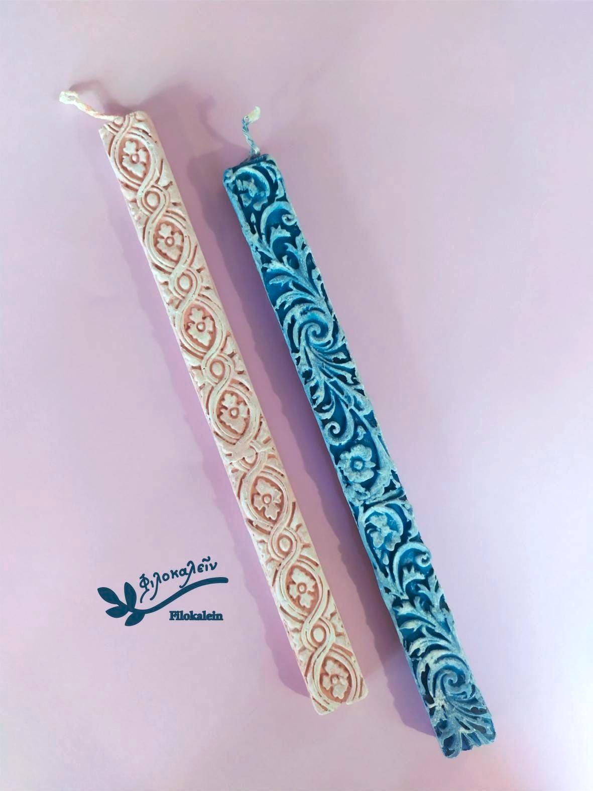 Baroque Greek Orthodox Easter Lampada Set – Pink Blue Sculpted Easter Candles for Couple – Elegant Matching Gift