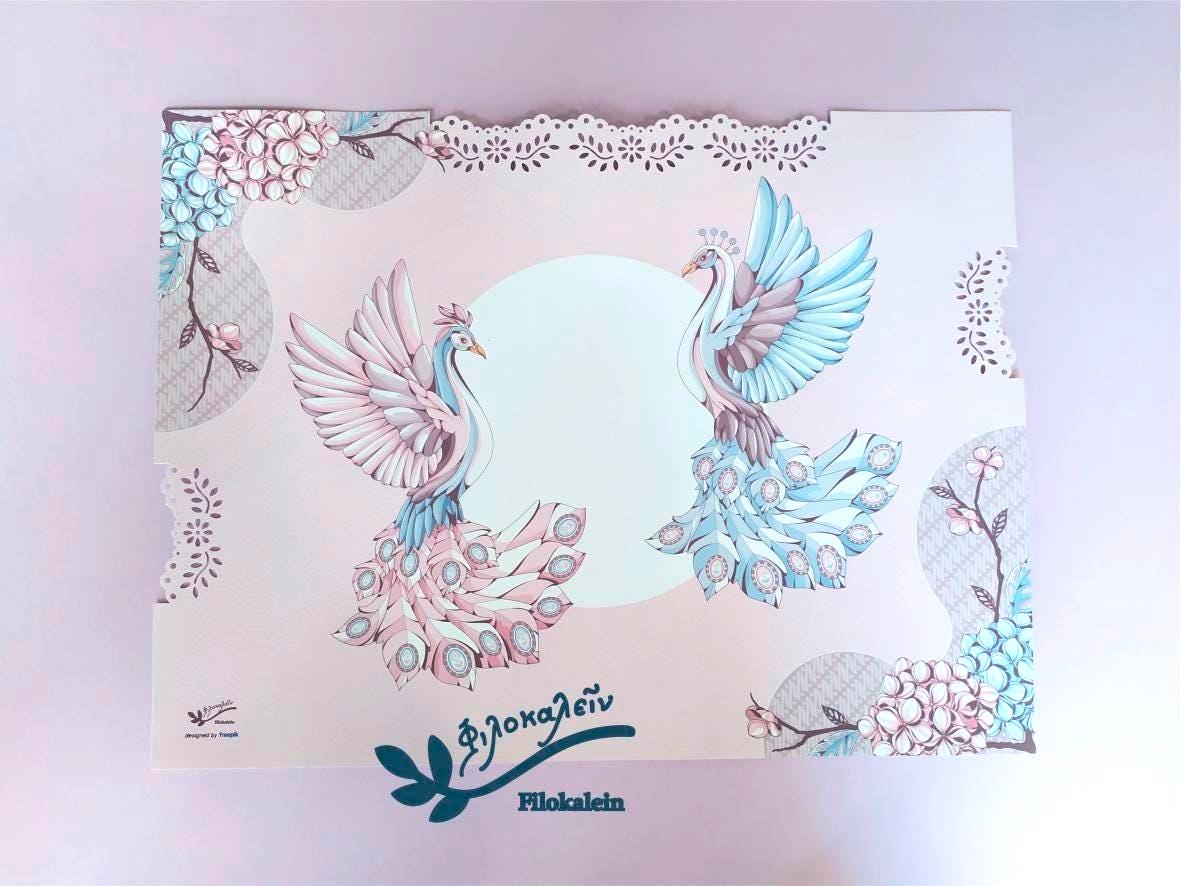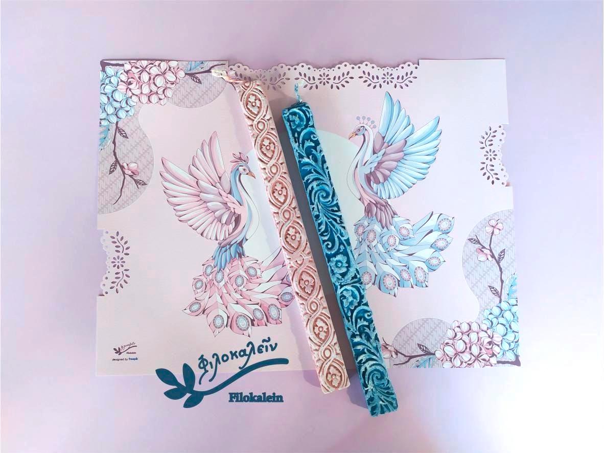 This baroque Greek Orthodox Easter lampada set is created for those who celebrate Easter side by side. The soft pink and deep blue sculpted Easter candles carry intricate ornamental designs, inspired by vintage baroque art and timeless craftsmanship.