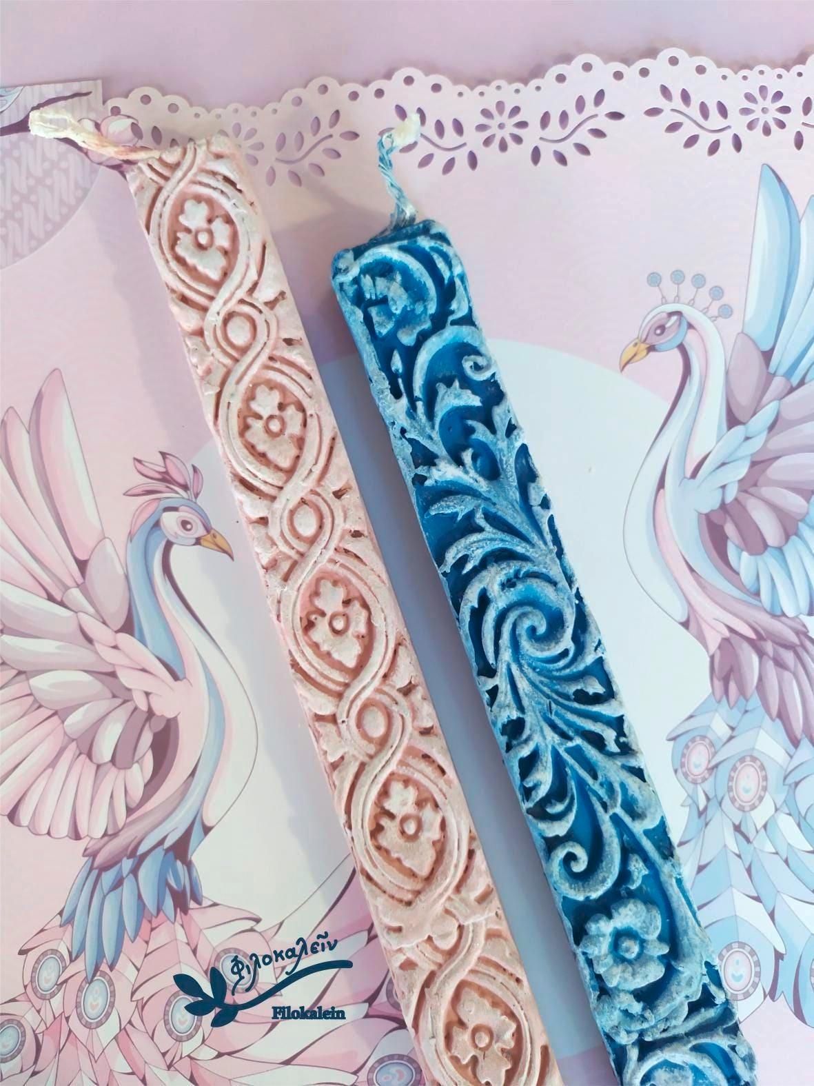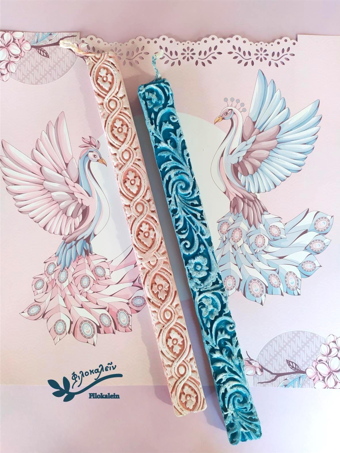 Baroque Greek Orthodox Easter Lampada Set, Pink Blue Sculpted Easter Candles for Couple, Elegant Matching Gift