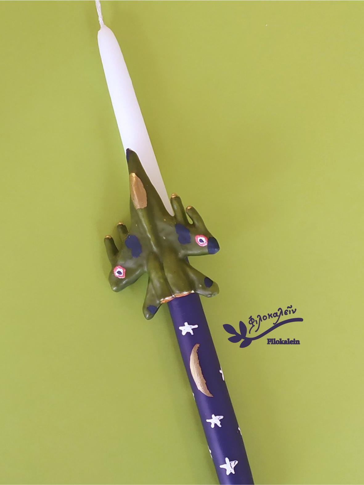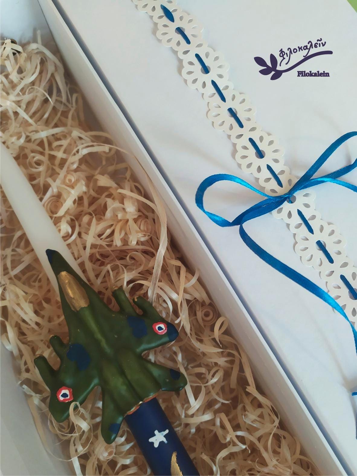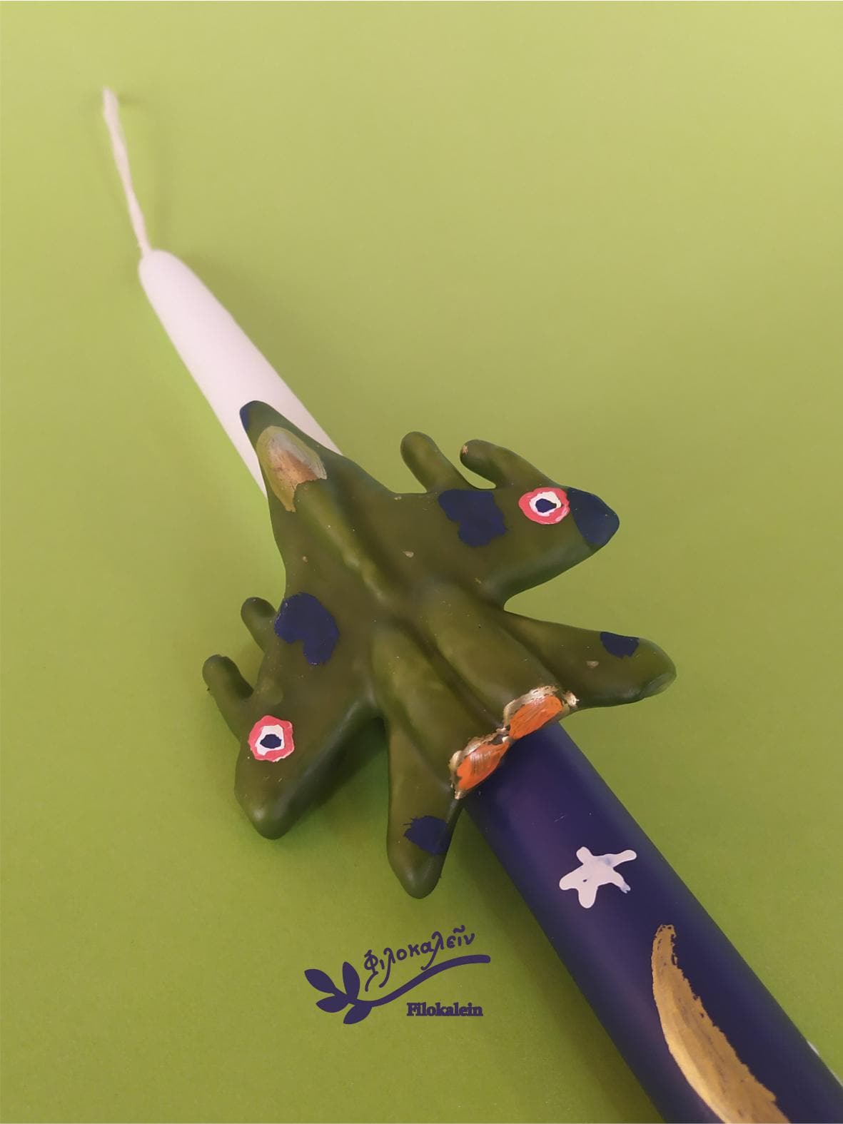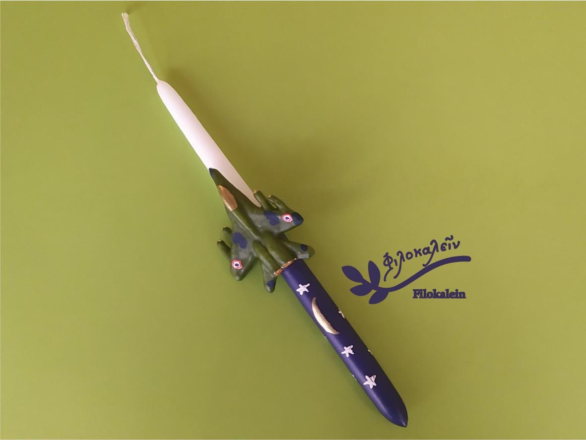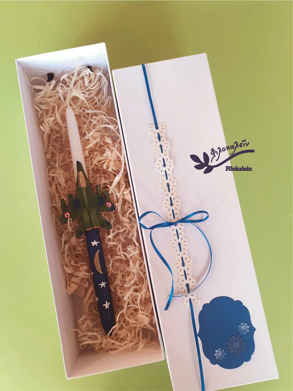This handmade Military Aircraft Easter Candle is created for boys who dream of flying, of adventure, of courage written across the sky. Sculpted carefully by hand, the green fighter jet embraces the candle as if soaring through a night horizon, transforming a traditional Easter lampada into a bold and unforgettable keepsake.