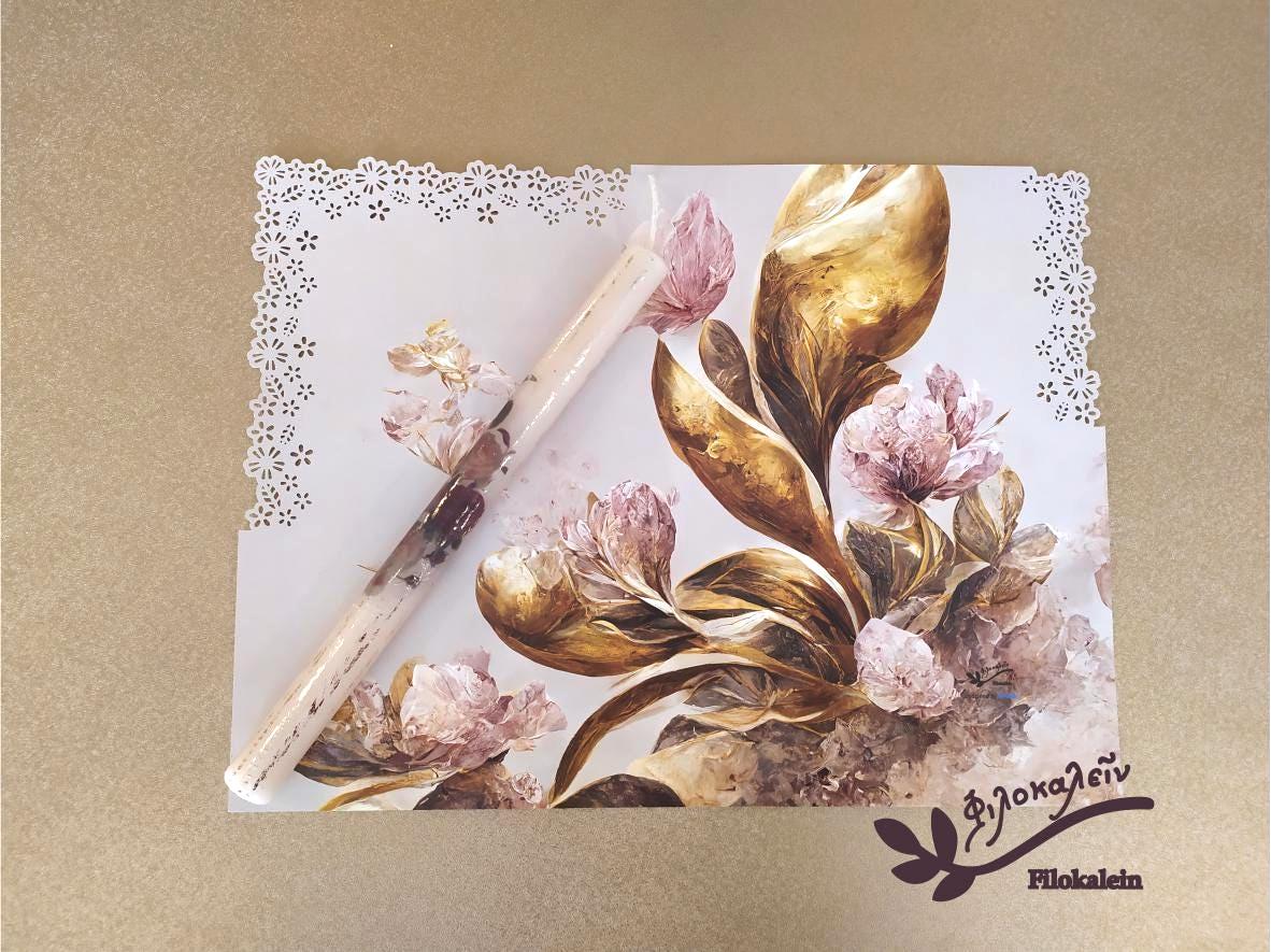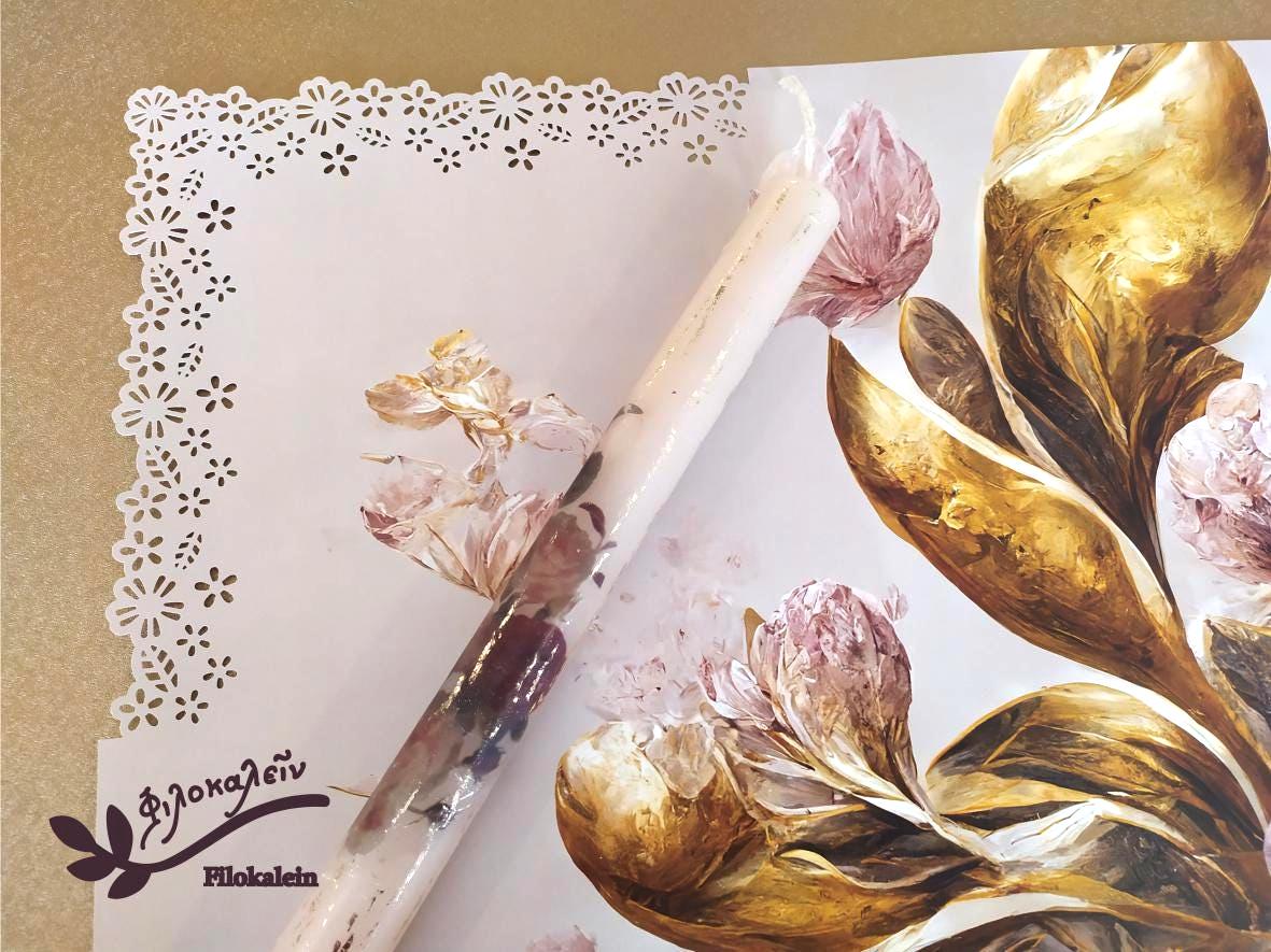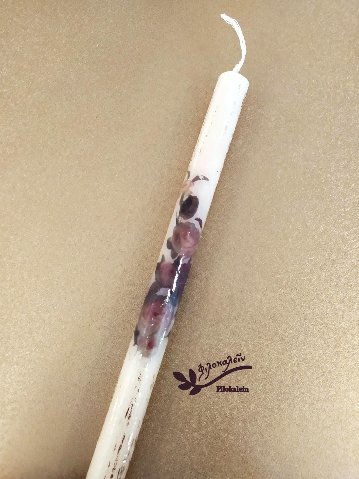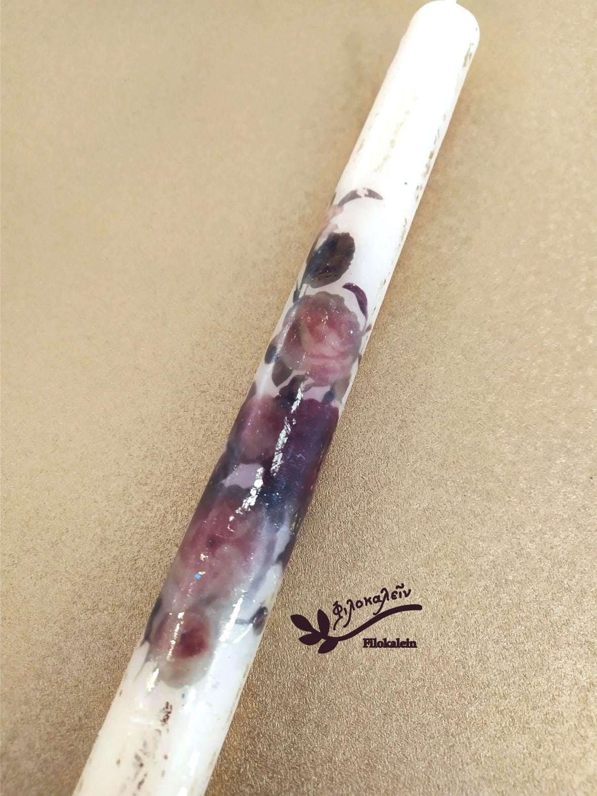 This hand painted Orthodox Easter candle is adorned with dark red roses — rich, velvety blooms that symbolize love, devotion, and quiet strength. Set against soft ivory wax, the roses unfold gently along the lampada, creating a refined and romantic luxury Greek Easter candle made for meaningful celebration.