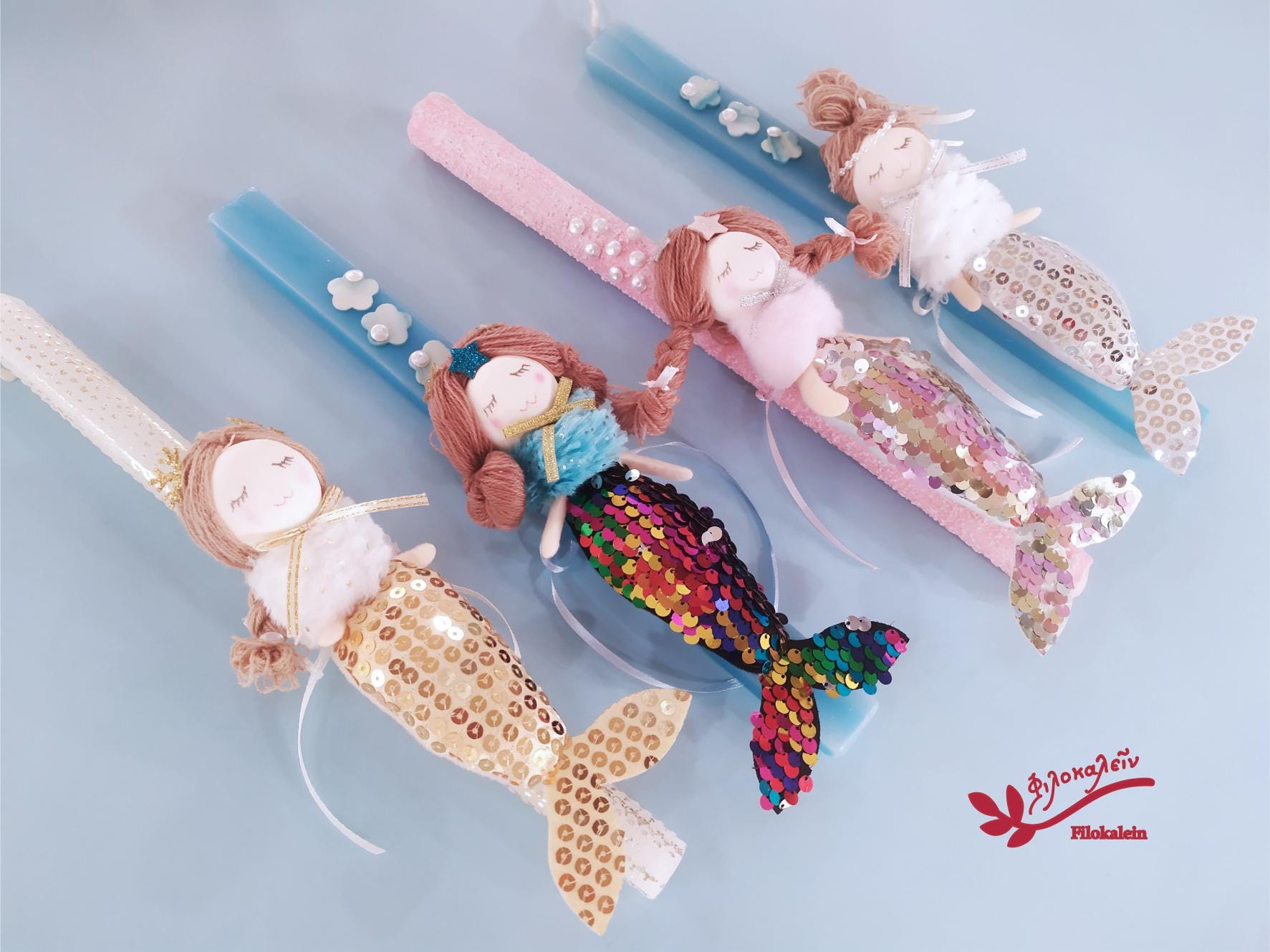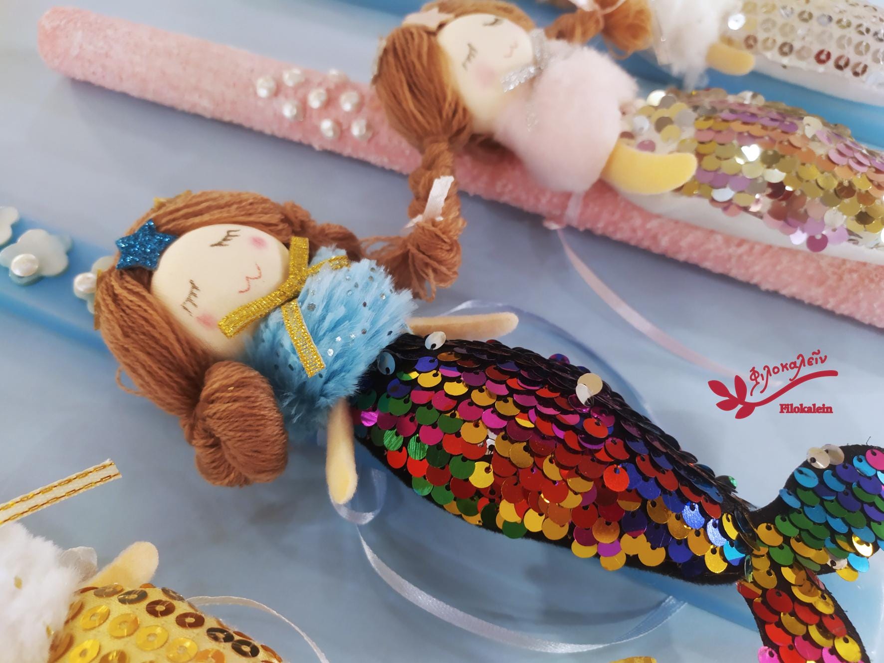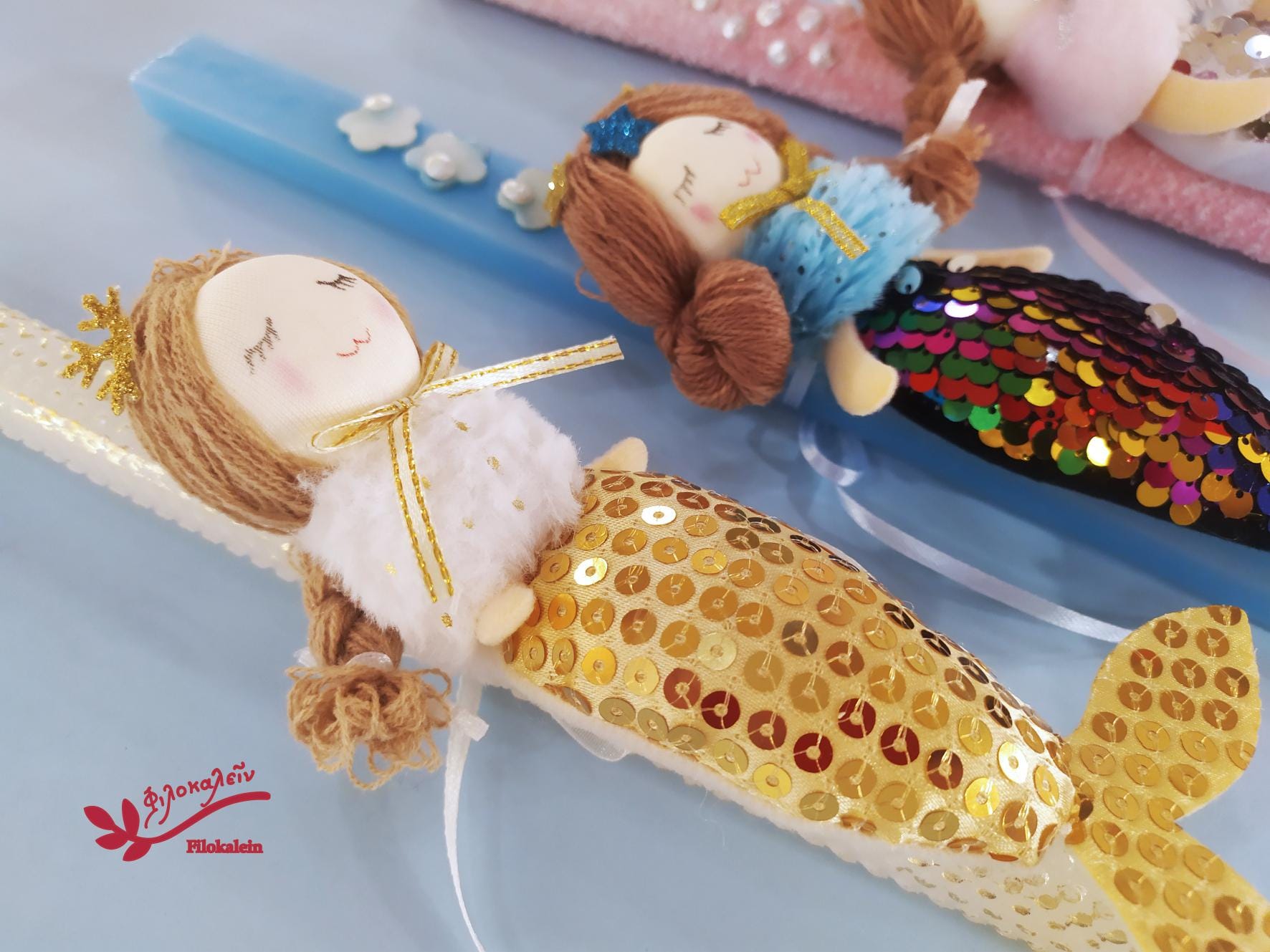 Her hair is gently tied, her eyes peacefully closed, as if she is listening to the sea. Her tail glitters in gold, rainbow, blush, or silver tones, stitched from fabric and sequins that glow beautifully beside the Easter flame.