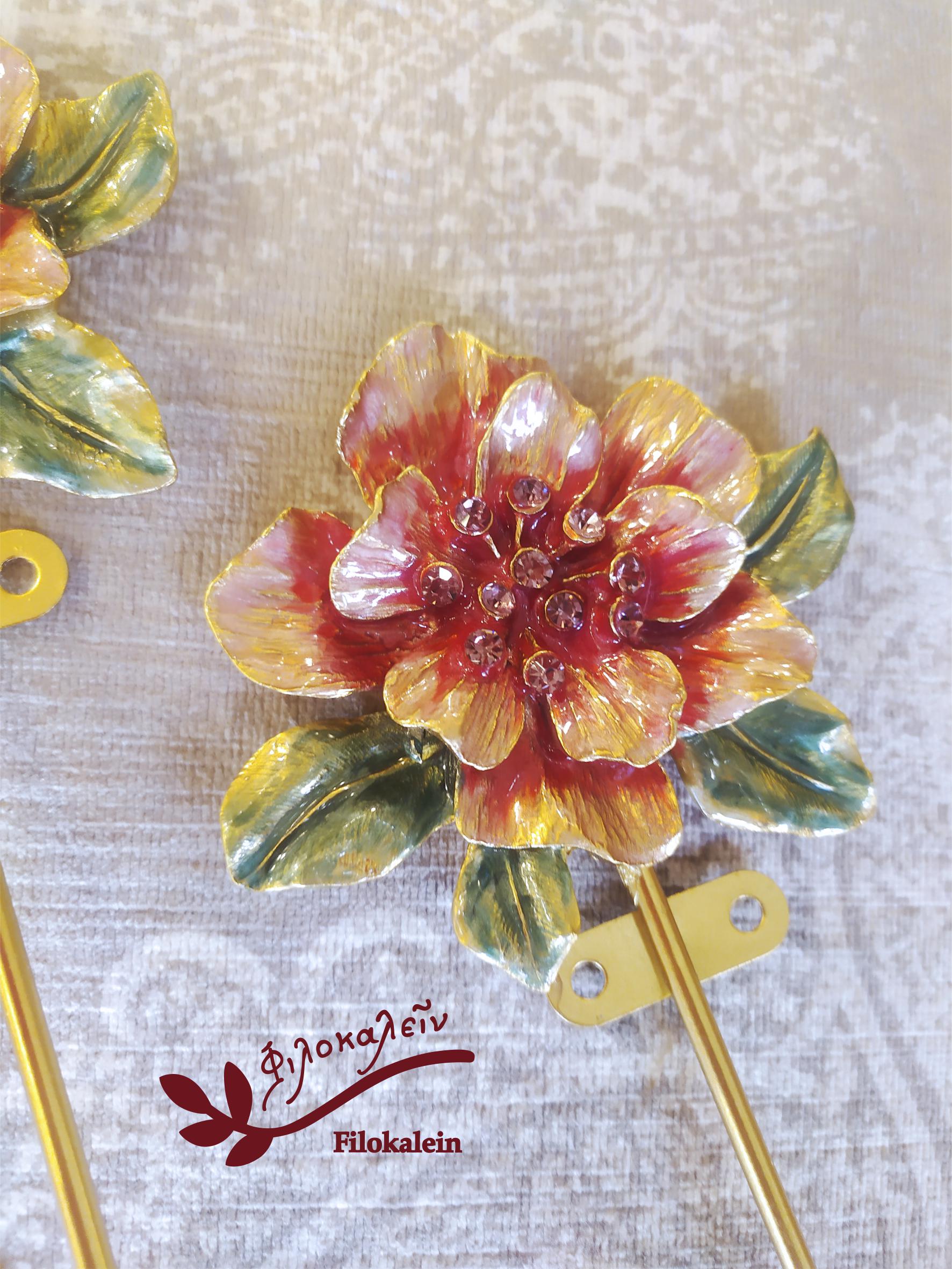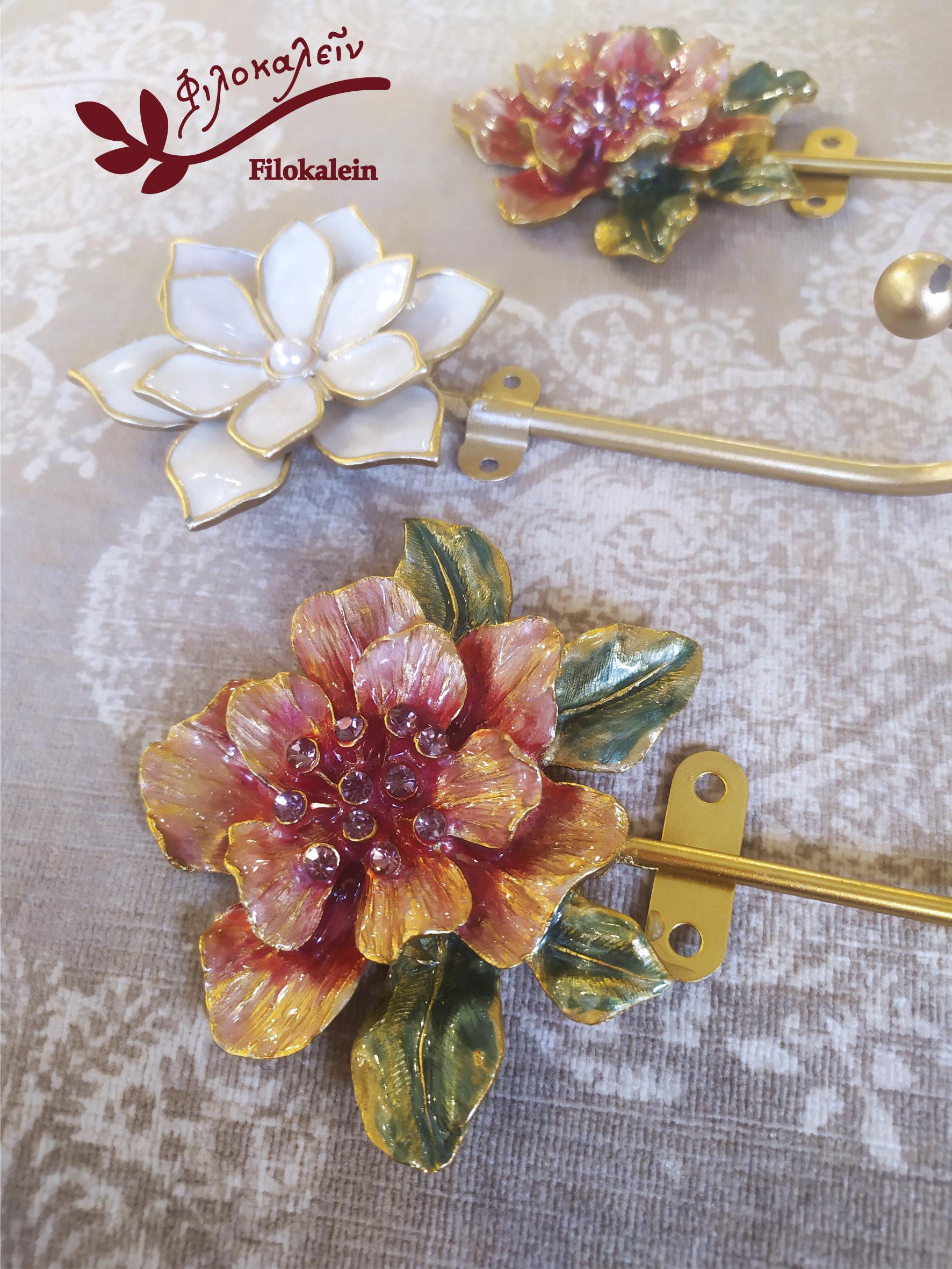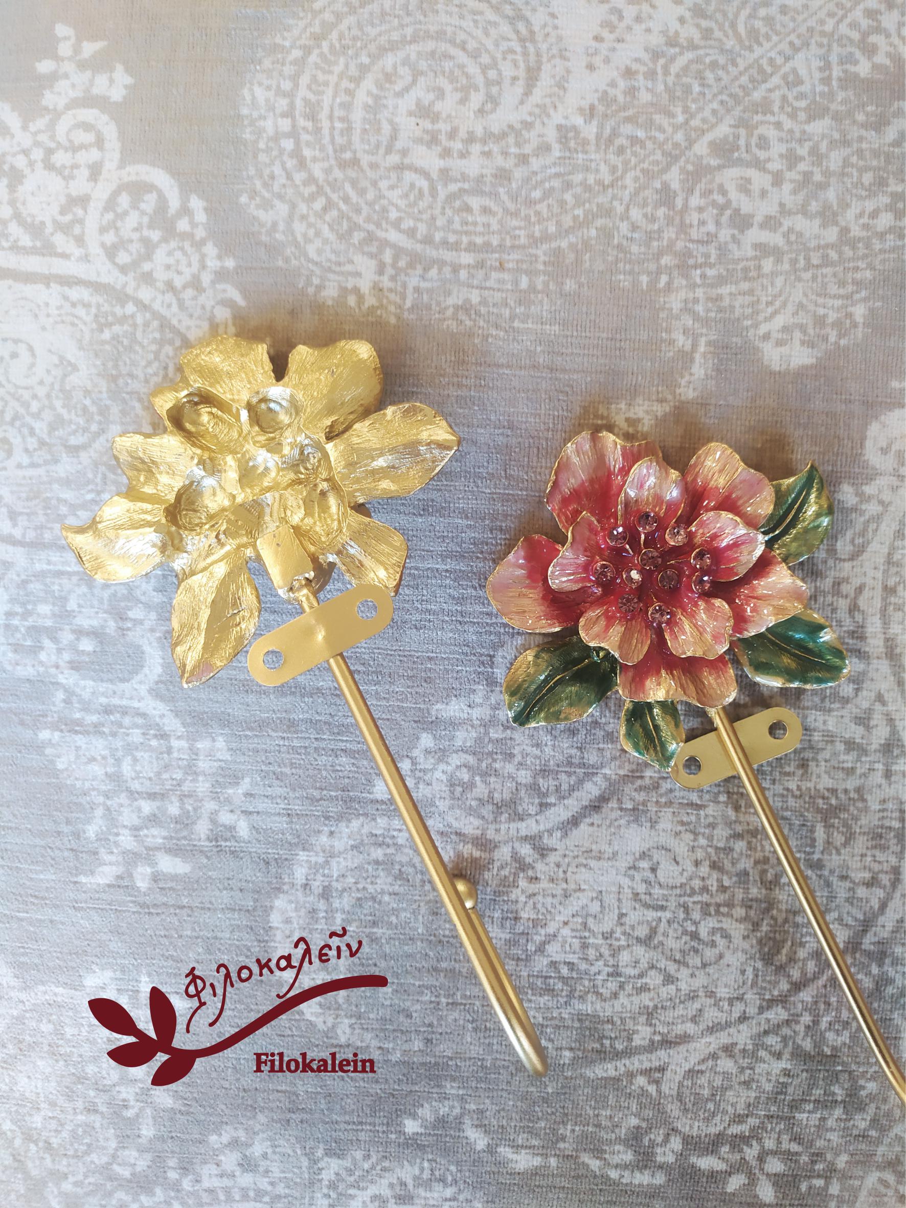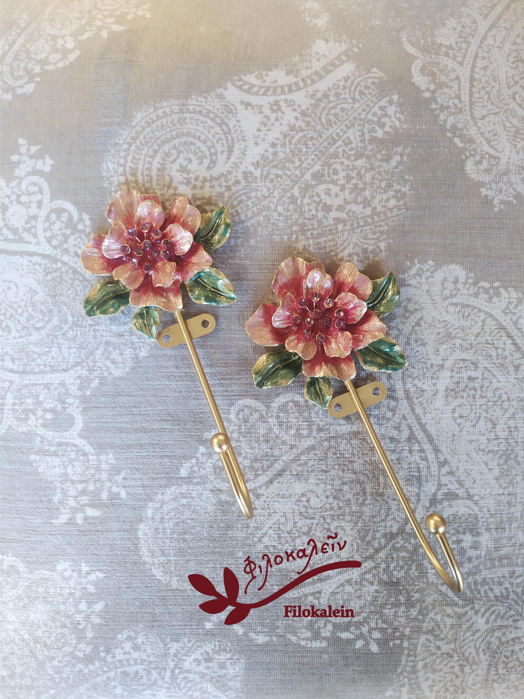Two radiant coral pink blossoms and one delicate white flower unfold on golden metal branches with green leaves and sparkling crystal details. Both decorative and practical, these vintage-inspired metal hooks gently hold coats, keys, scarves or towels while bringing soft botanical romance to your entryway, bedroom or bathroom.