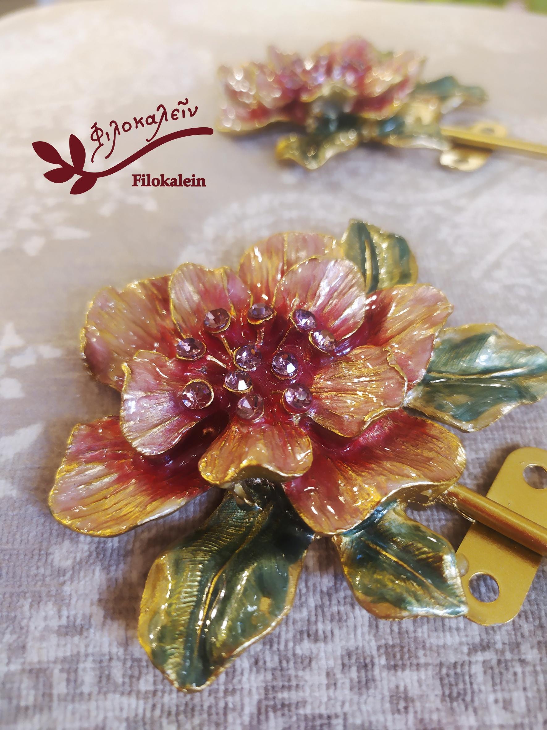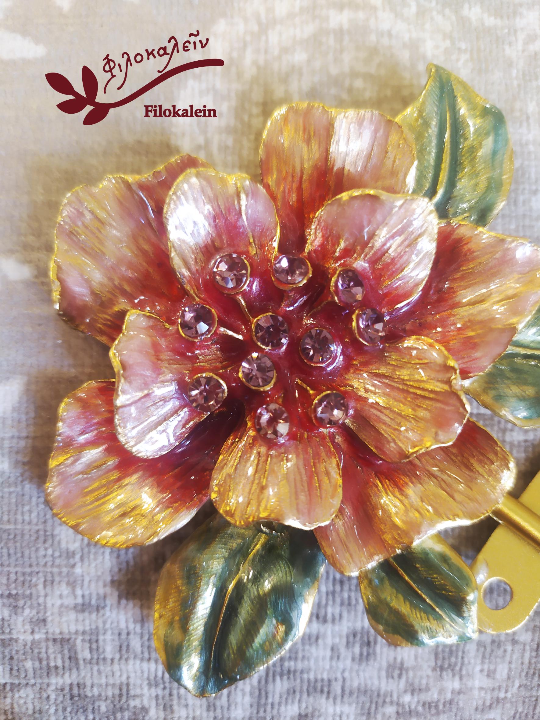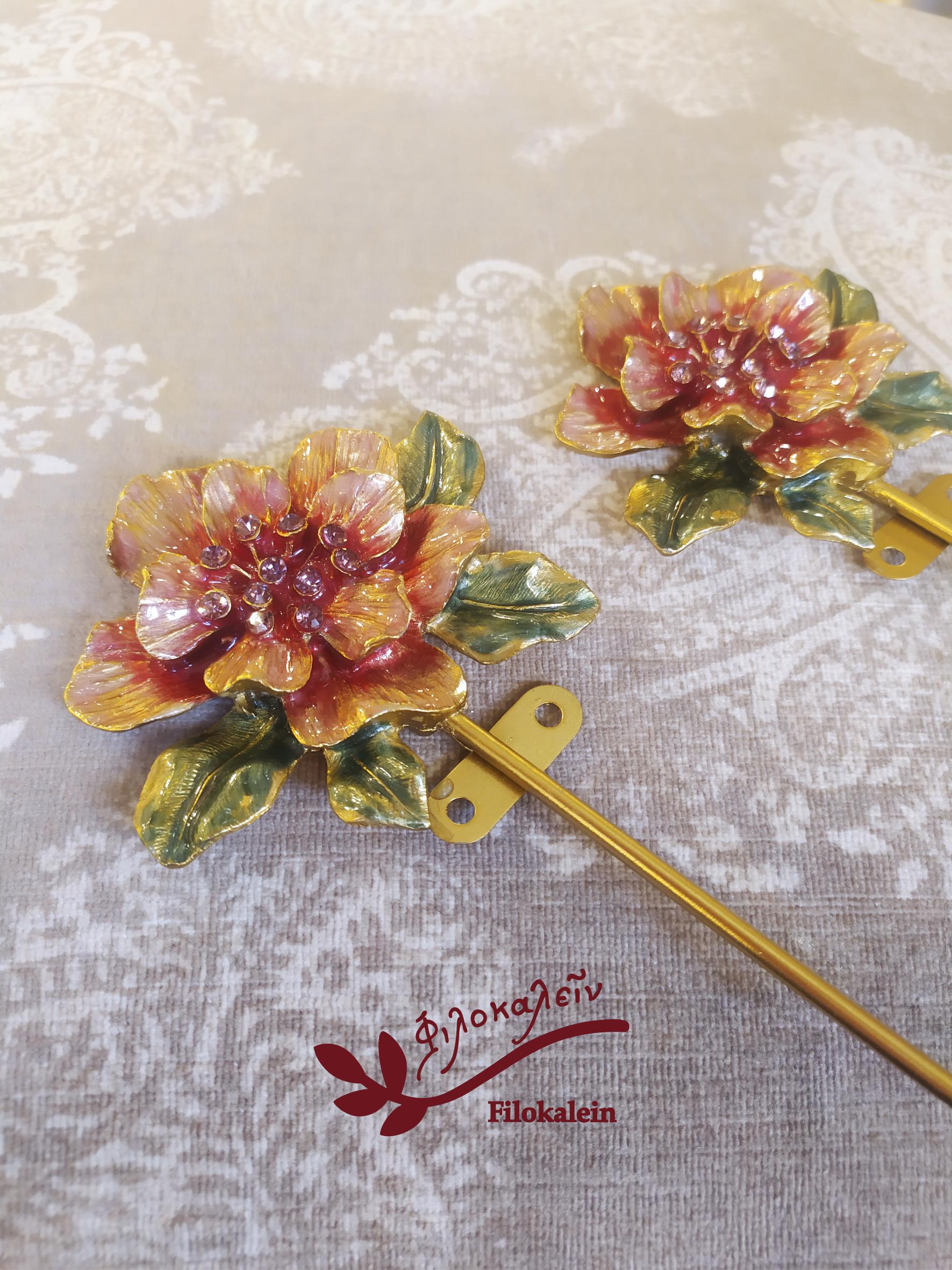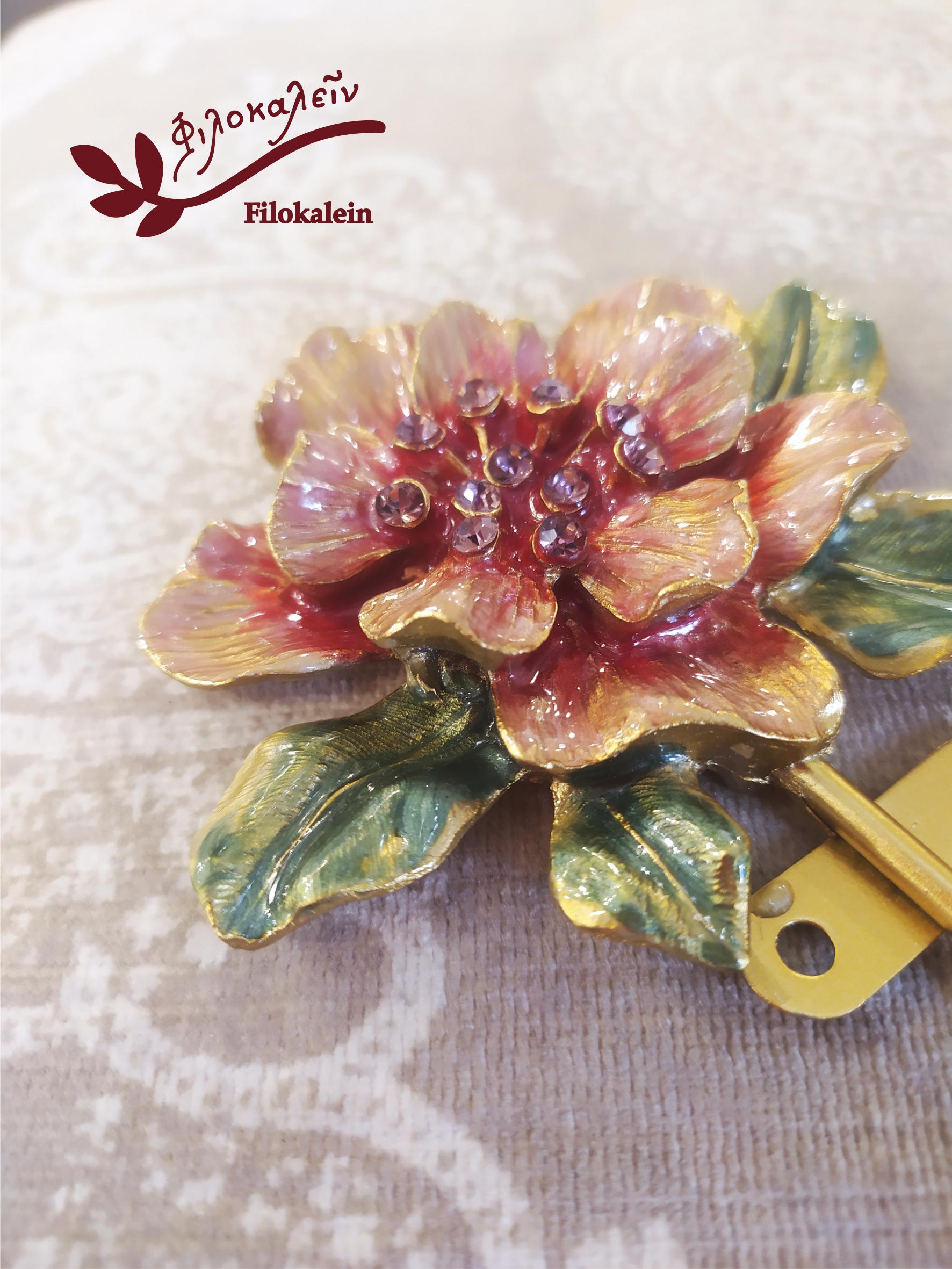 Two radiant coral pink blossoms and one delicate white flower unfold on golden metal branches with green leaves and sparkling crystal details. Both decorative and practical, these vintage-inspired metal hooks gently hold coats, keys, scarves or towels while bringing soft botanical romance to your entryway, bedroom or bathroom.
