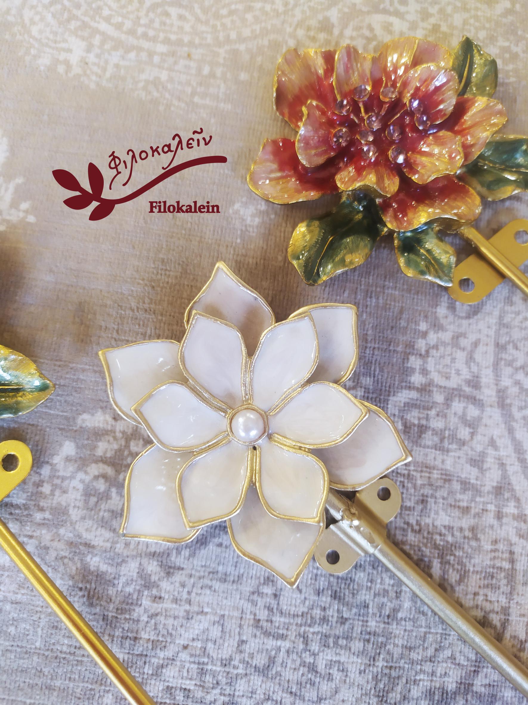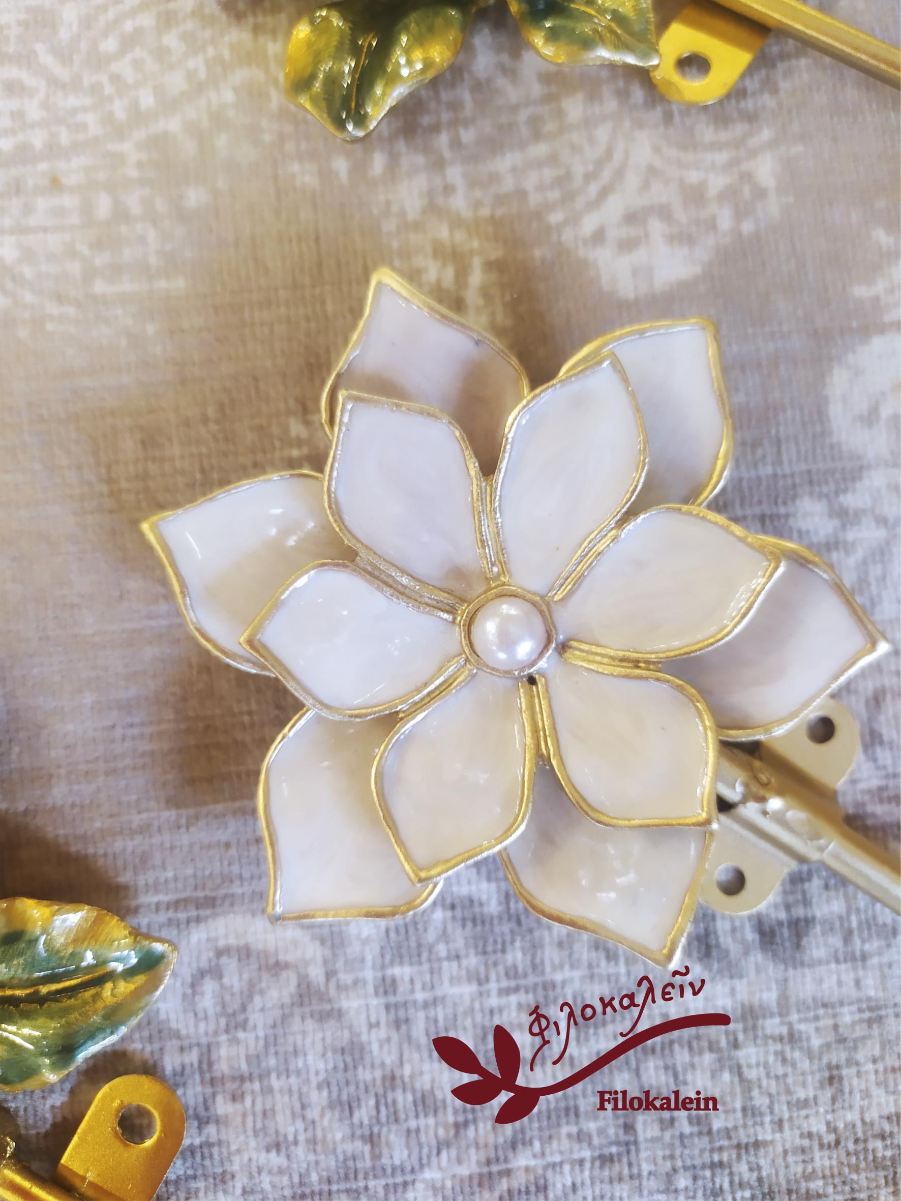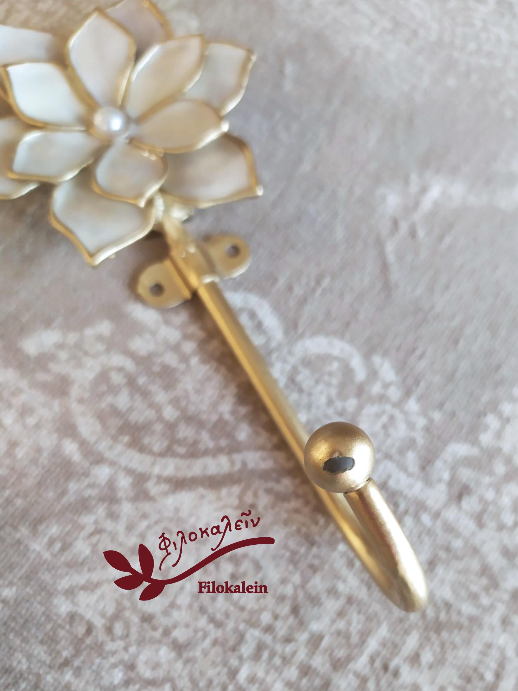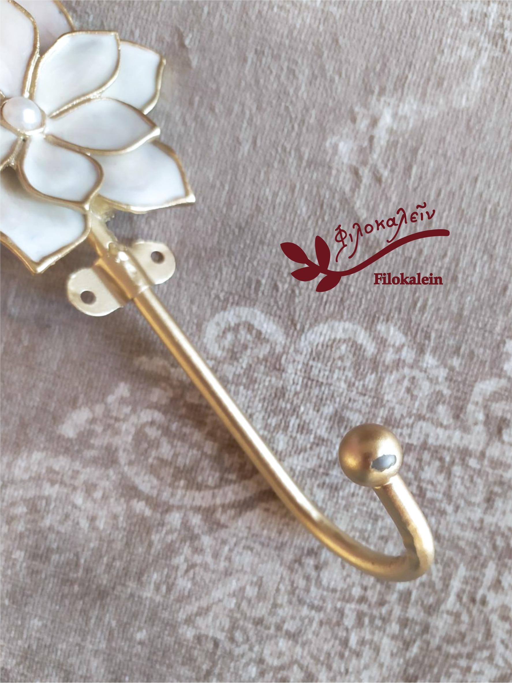 Please note: The white floral hook features a small area at the edge where the gold finish has gently worn, as shown in the photo. This minor imperfection is purely cosmetic and adds to the unique vintage character of the piece.