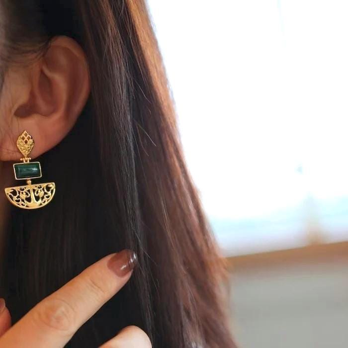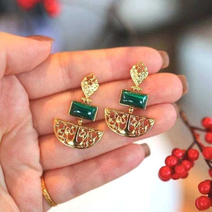 At the center, deep green genuine malachite stones glow with natural striations—each one unique, like a piece of earth’s poetry. Known for its symbolic energy of protection, balance, and transformation, malachite brings both beauty and meaning to every wear.