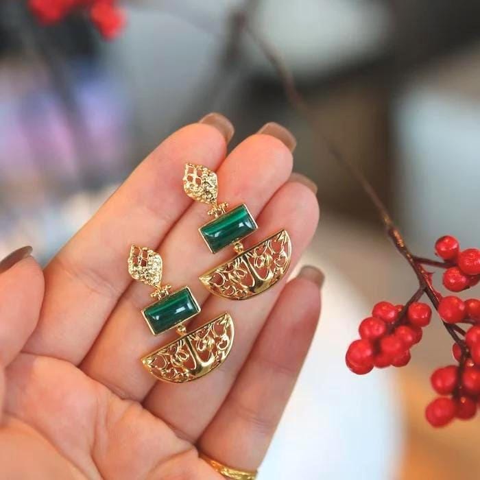 Malachite Drop Earrings Gold, Green Gemstone Dangle Earrings, Vintage Fan Earrings, Gold Vermeil Statement Jewelry Gift for Her